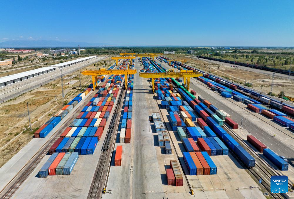 This aerial photo taken on Sept. 6, 2023 shows the load-transfer yard of Horgos station in Horgos, northwest China's Xinjiang Uygur Autonomous Region. The number of China-Europe (Central Asia) freight trains passing Horgos Port in northwest China's Xinjiang Uygur Autonomous Region has reached 5,156 by the end of August this year, 11.6 percent higher than that of the same period a year earlier, according to statistics released by the local railway authority. (Xinhua/Zhao Ge)