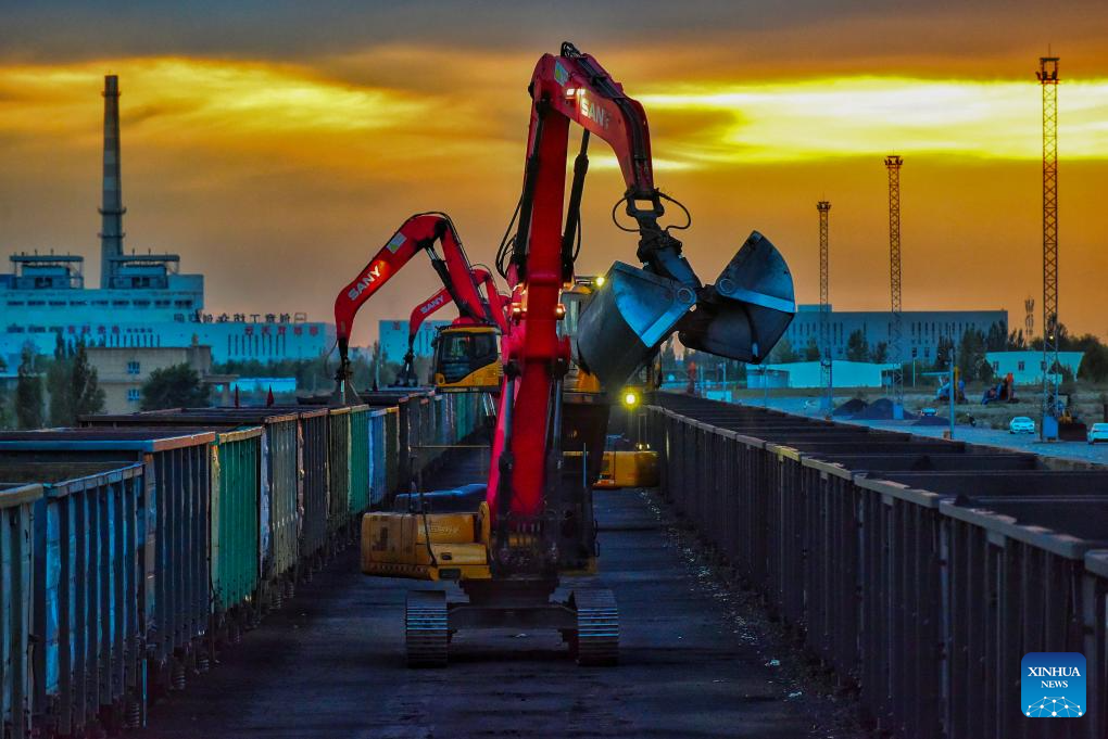 Grabbing machines transfer bulk cargo at the load-transfer yard of Horgos station in Horgos, northwest China's Xinjiang Uygur Autonomous Region, on Sept. 6, 2023. The number of China-Europe (Central Asia) freight trains passing Horgos Port in northwest China's Xinjiang Uygur Autonomous Region has reached 5,156 by the end of August this year, 11.6 percent higher than that of the same period a year earlier, according to statistics released by the local railway authority. (Xinhua/Zhao Ge)