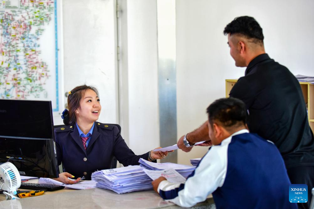 A staff member (L) processes international transportation documents for clients at Horgos Railway Port in Horgos, northwest China's Xinjiang Uygur Autonomous Region, on Sept. 6, 2023. The number of China-Europe (Central Asia) freight trains passing Horgos Port in northwest China's Xinjiang Uygur Autonomous Region has reached 5,156 by the end of August this year, 11.6 percent higher than that of the same period a year earlier, according to statistics released by the local railway authority. (Xinhua/Zhao Ge)