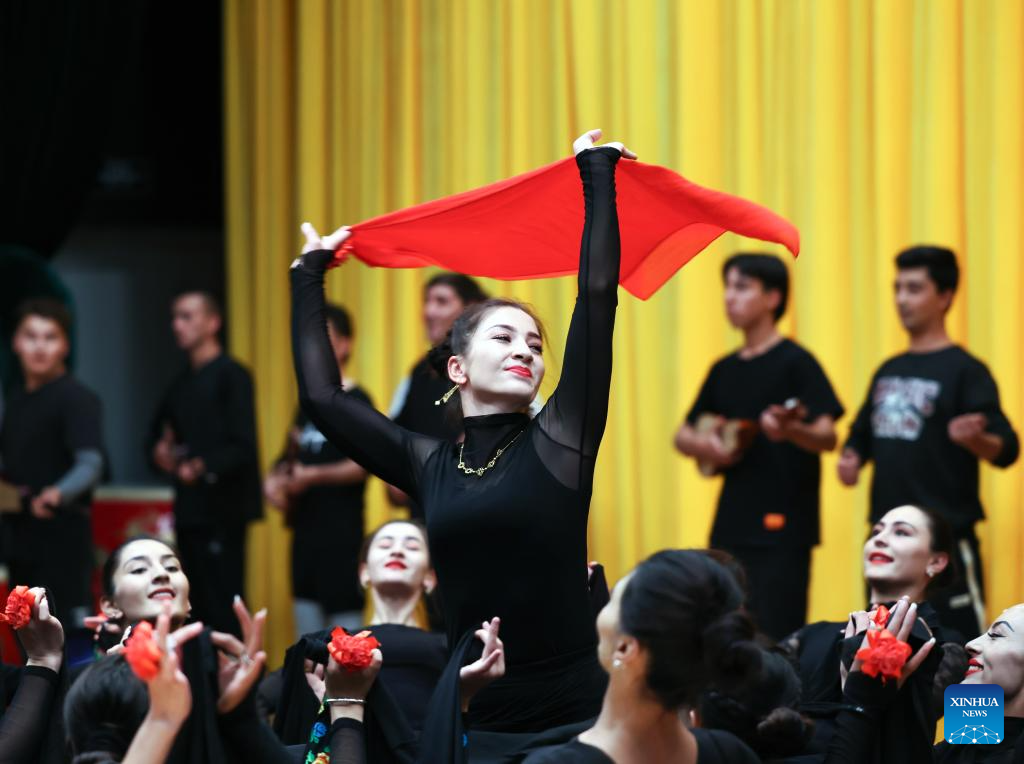 Gulbanur Kurqak and other dancers rehearse a dance program in Taxkorgan Tajik Autonomous County, northwest China's Xinjiang Uygur Autonomous Region, Sept. 4, 2023. (Xinhua/Lan Hongguang)