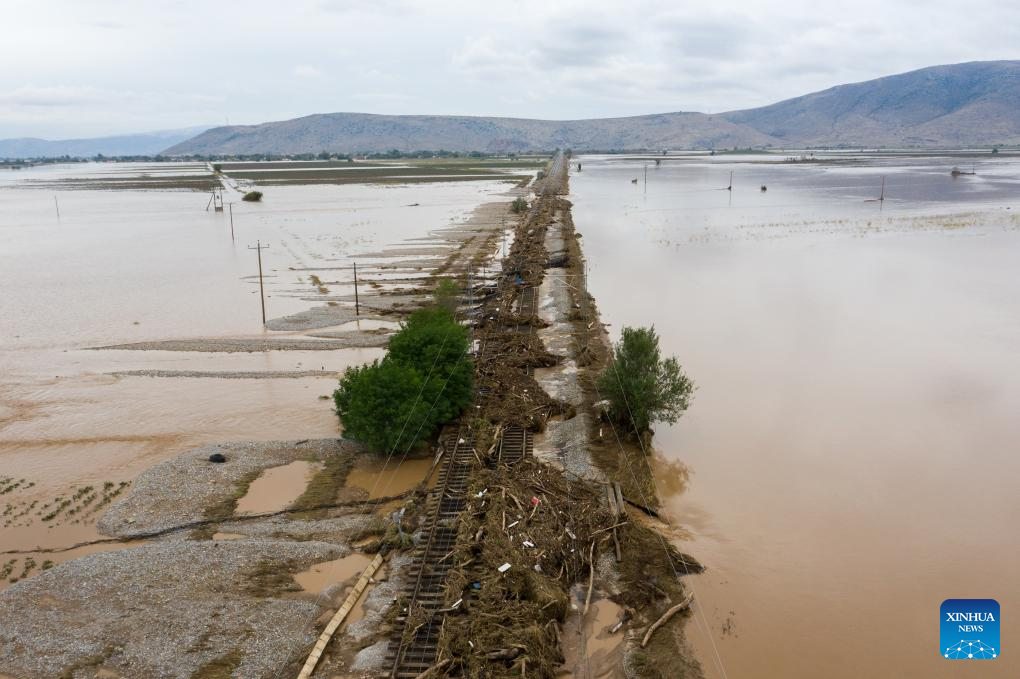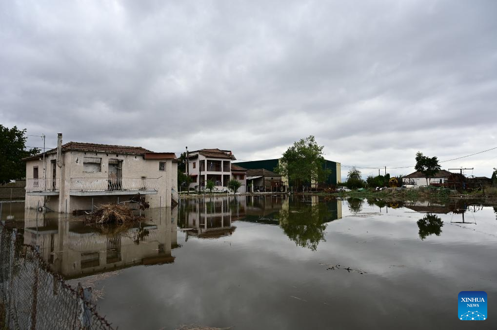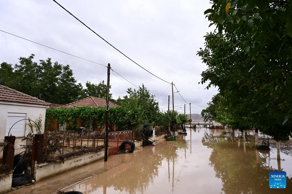 Photo taken on Sept. 7, 2023 shows a flood-effected area in Karditsa, Thessaly region, Greece. The death toll from extensive flooding caused by torrential rains in central Greece this week has reached six, with the bodies of two elderly women recovered in the Thessaly region on Thursday afternoon, Greek national broadcaster ERT has reported. (Photo by Antonis Nikolopoulos/Xinhua)