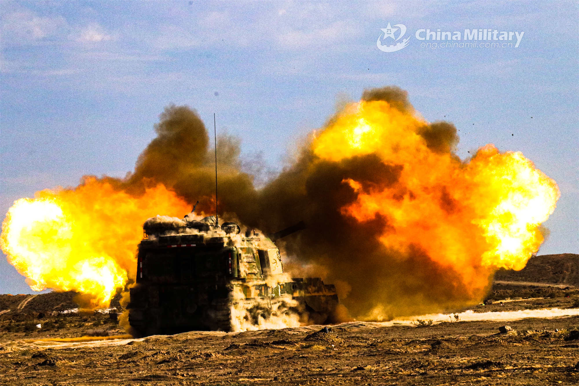 An armored vehicle attached to a brigade under the PLA 82nd Group Army fires its main weapon down range at mock targets during a live-fire test in late August. (eng.chinamil.com.cn/Photo by Cheng Chunlei)