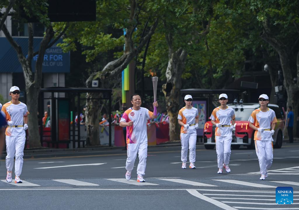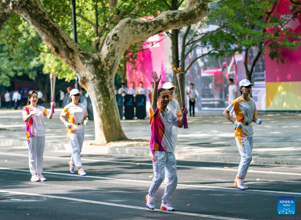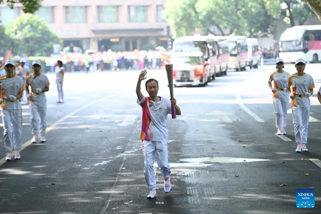 Torch bearer Xu Chuanzi runs with the torch during the torch relay of the 19th Asian Games in Hangzhou, capital of east China's Zhejiang Province, Sept. 8, 2023. (Xinhua/Huang Zongzhi)