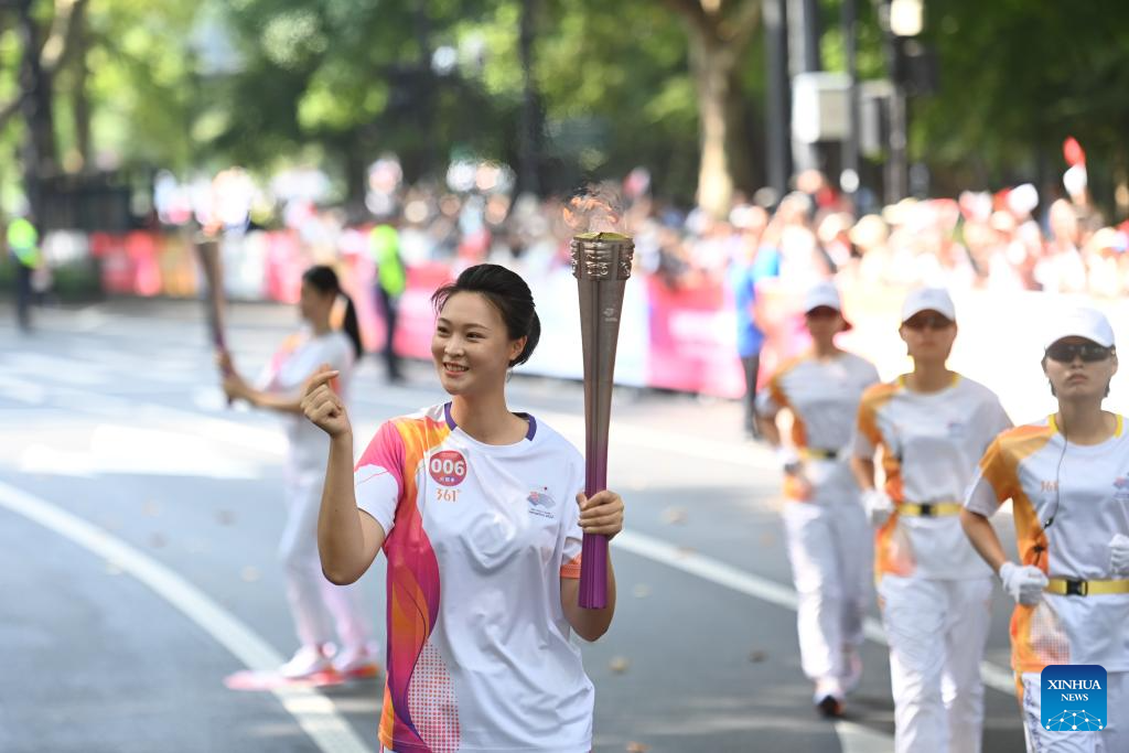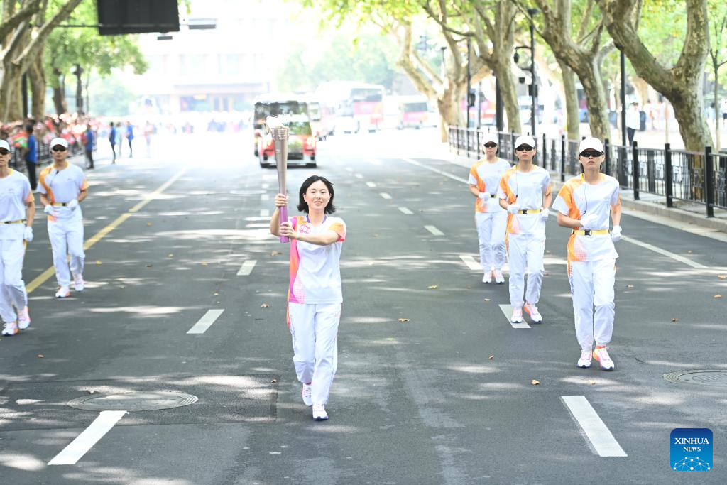 Torch bearer Zhu Jiner runs with the torch during the torch relay of the 19th Asian Games in Hangzhou, capital of east China's Zhejiang Province, Sept. 8, 2023. (Xinhua/Huang Zongzhi)
