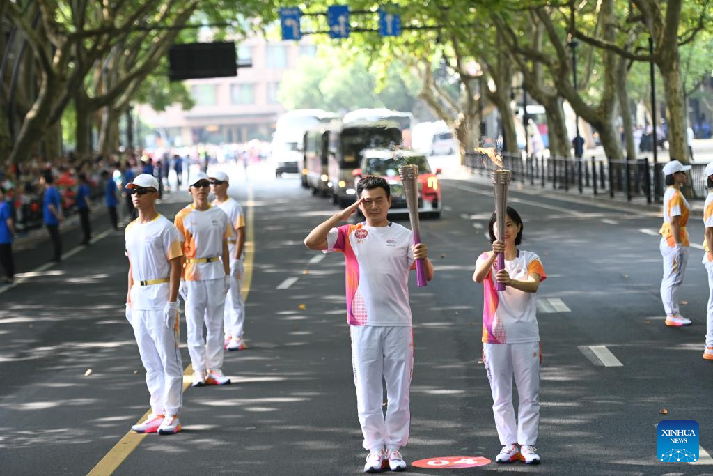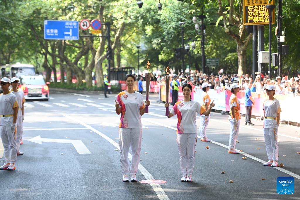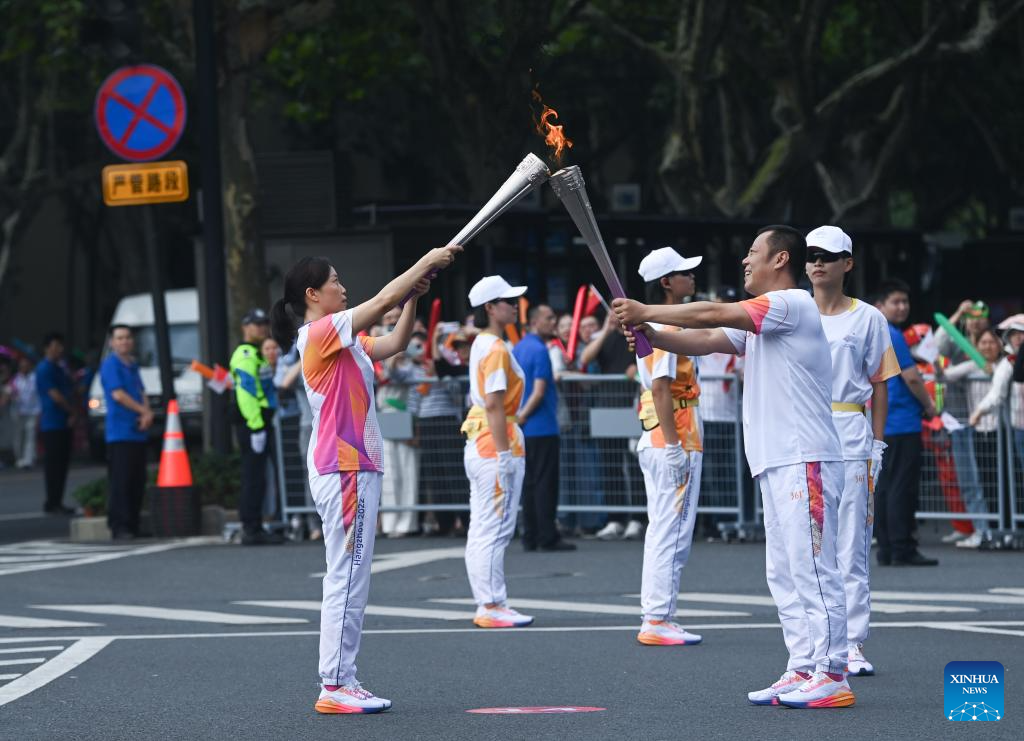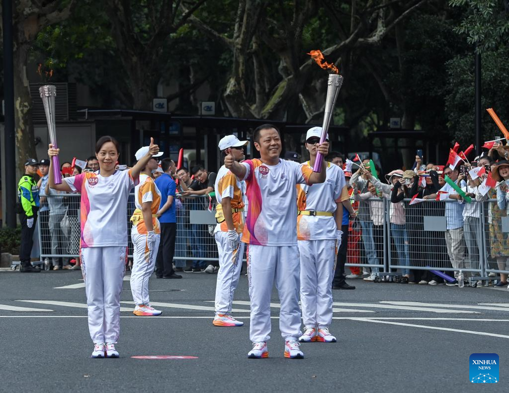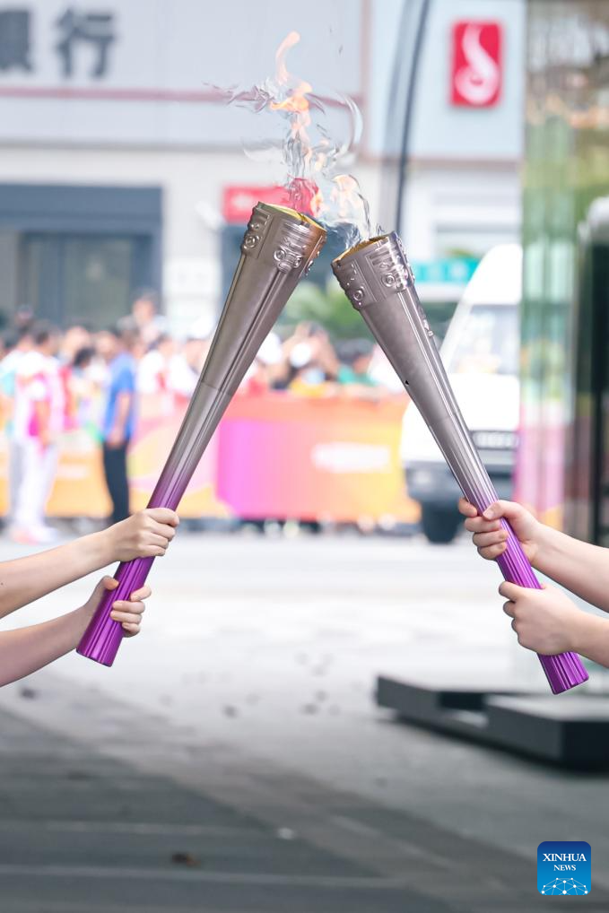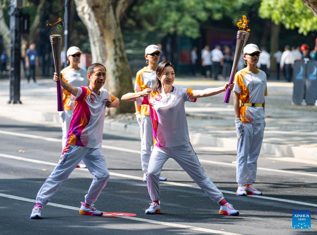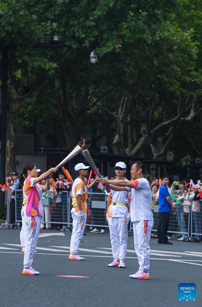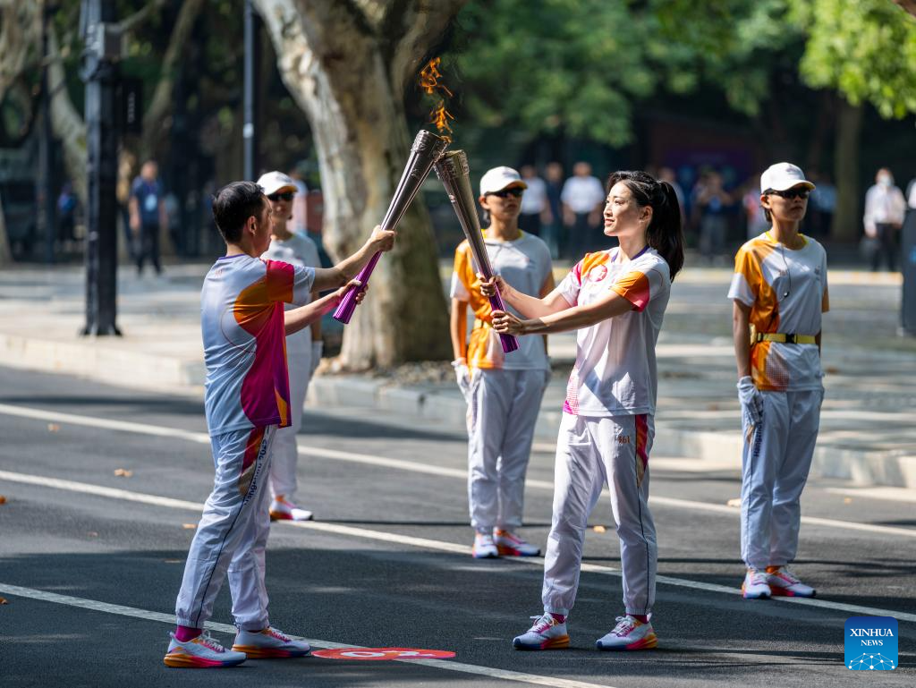Torch bearers pass the flame during the torch relay of the 19th Asian Games in Hangzhou, capital of east China's Zhejiang Province, Sept. 8, 2023. (Xinhua/Jiang Han)