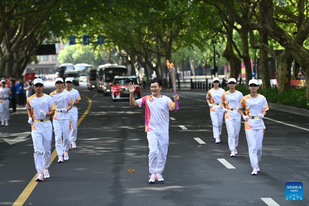 Torch bearer Zhong Yi runs with the torch during the torch relay of the 19th Asian Games in Hangzhou, capital of east China's Zhejiang Province, Sept. 8, 2023. (Xinhua/Huang Zongzhi)