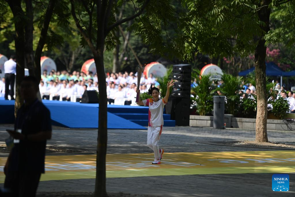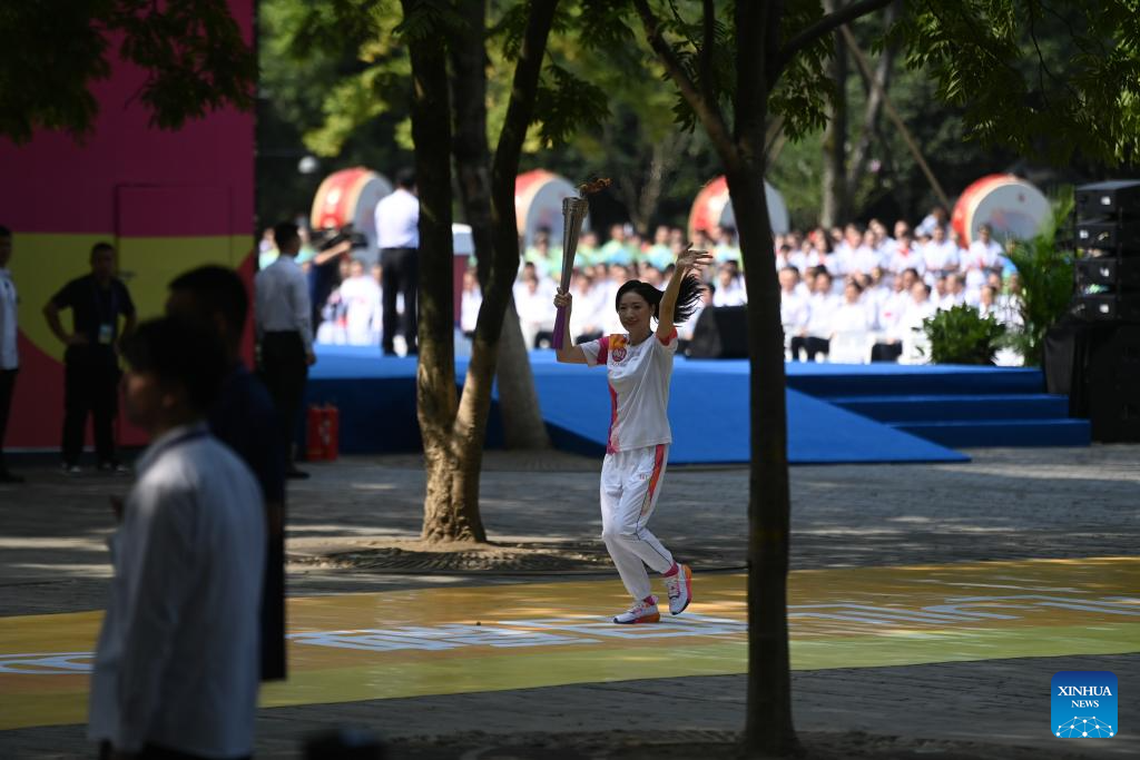 Torch bearer Hui Ruoqi runs with the torch during the torch relay of the 19th Asian Games in Hangzhou, capital of east China's Zhejiang Province, Sept. 8, 2023. (Xinhua/Huang Zongzhi)