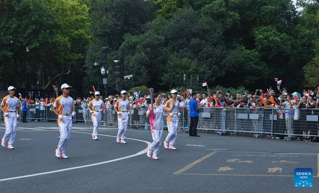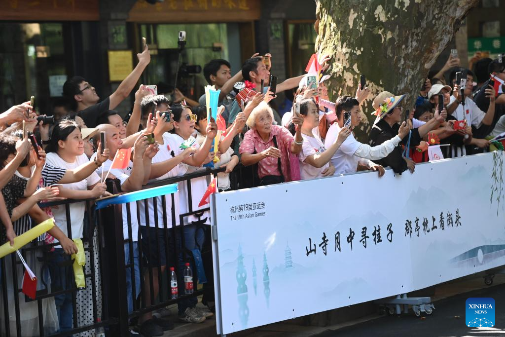 People watch the torch relay of the 19th Asian Games in Hangzhou, capital of east China's Zhejiang Province, Sept. 8, 2023. (Xinhua/Huang Zongzhi)