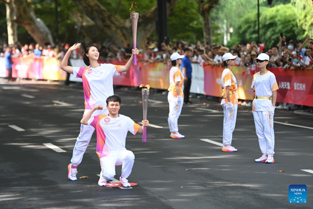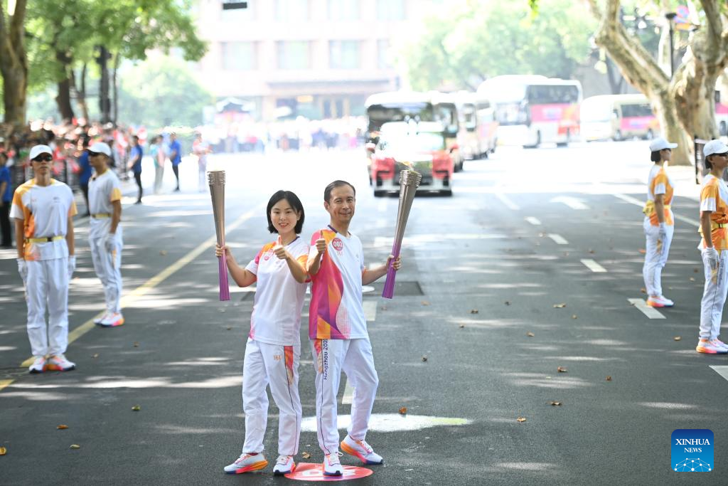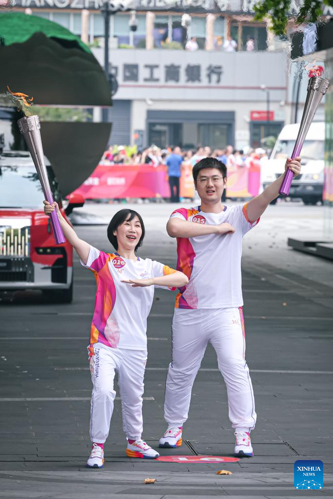 Torch bearers Hui Ruoqi (top) and Lin Junmin pose during the torch relay of the 19th Asian Games in Hangzhou, capital of east China's Zhejiang Province, Sept. 8, 2023. (Xinhua/Huang Zongzhi)