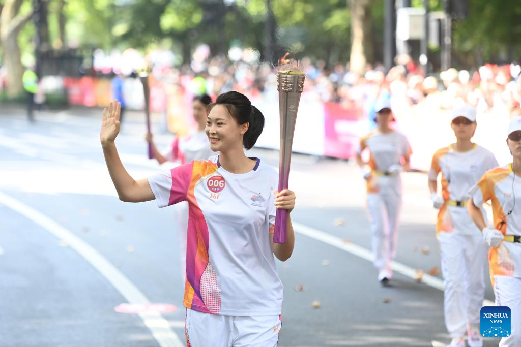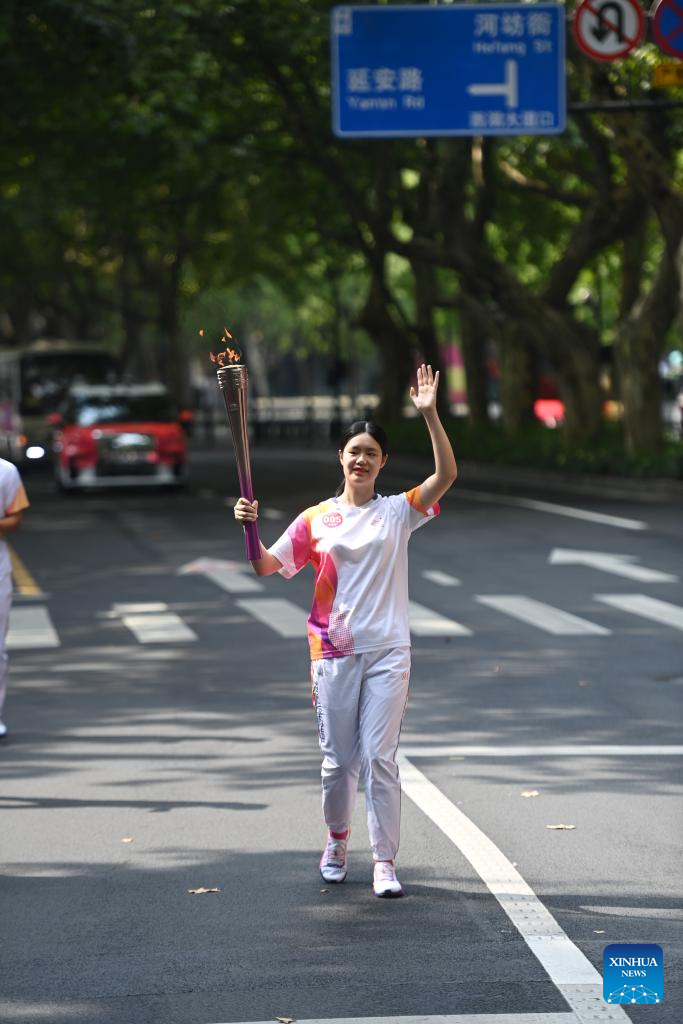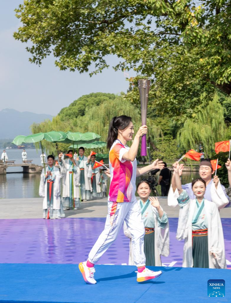 Torch bearer Lou Yilan runs with the torch during the torch relay of the 19th Asian Games in Hangzhou, capital of east China's Zhejiang Province, Sept. 8, 2023. (Xinhua/Jiang Han)