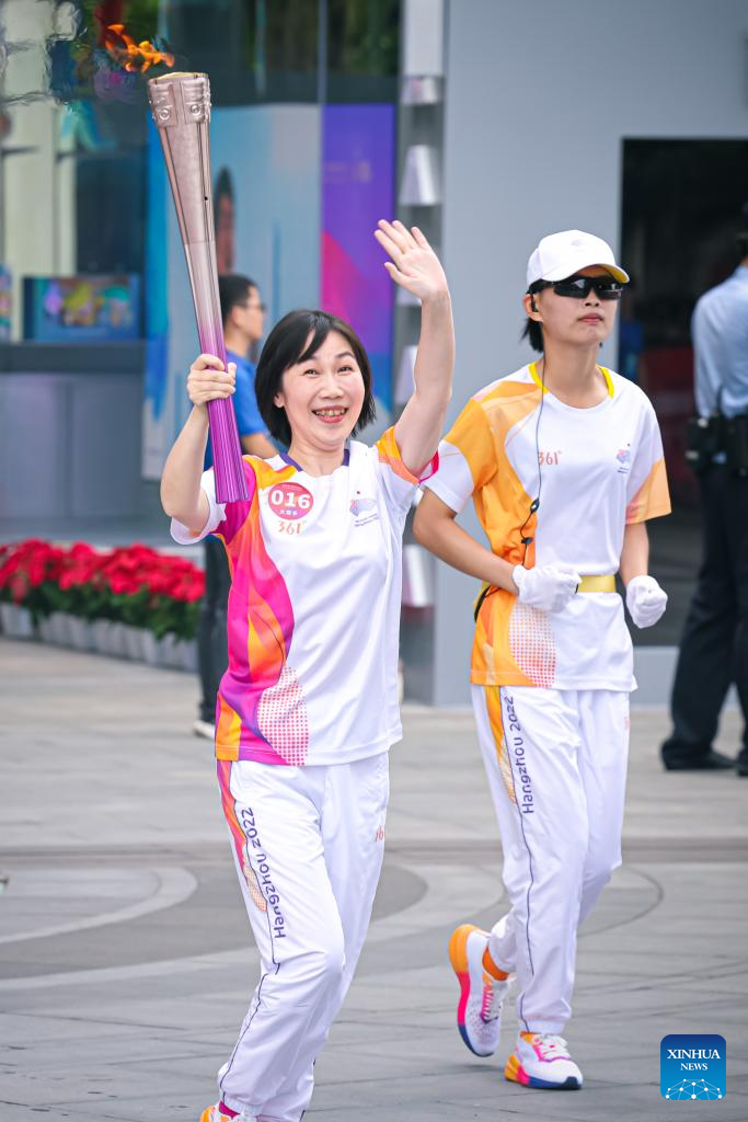 Torch bearer Luo Xuejuan runs with the torch during the torch relay of the 19th Asian Games in Hangzhou, capital of east China's Zhejiang Province, Sept. 8, 2023. (Xinhua/Sun Fei)