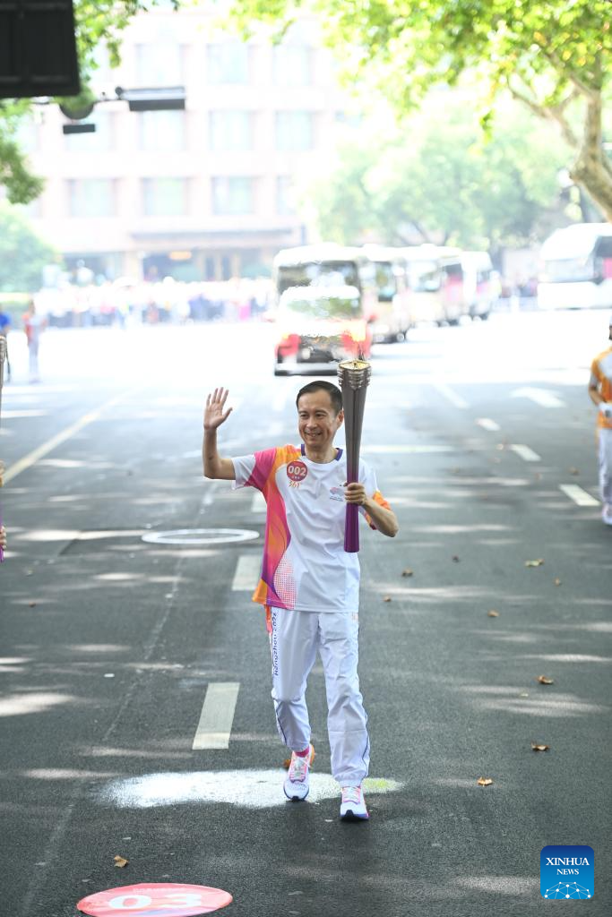 Torch bearer Zhang Yong runs with the torch during the torch relay of the 19th Asian Games in Hangzhou, capital of east China's Zhejiang Province, Sept. 8, 2023. (Xinhua/Huang Zongzhi)