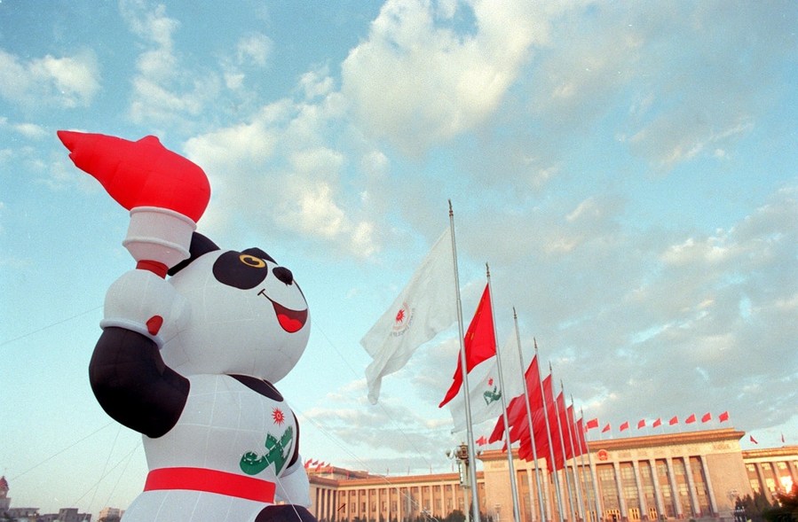 Photo taken on Aug. 22, 1990 shows "Panpan", mascot of the 11th Asian Games, at Tian'anmen Square of Beijing, capital of China. (Xinhua/Wu Jiguo)
