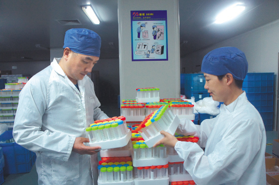 Qinwang Renzeng (R) and his wife Wang Chaoying inspect product quality at Zhejiang Runlab Technology Co., Ltd.,in Taizhou city, eastern China's Zhejiang Province. (Photo provided to People’s Daily Online)