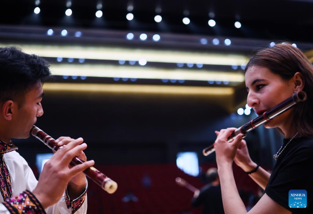 Artists of a local art troupe rehearse a program for a music festival in Taxkorgan Tajik Autonomous County, northwest China's Xinjiang Uygur Autonomous Region, Sept. 4, 2023. Taxkorgan Tajik Autonomous County has made great efforts in the integration of local culture and tourism in recent years, enriching the cultural life of people and promoting foreign exchanges. The county also carries forward traditional Chinese culture to build cultural tourism festivals, which shows the scenery of the Pamir Plateau and the happy and stable life of the people. (Xinhua/Lan Hongguang)