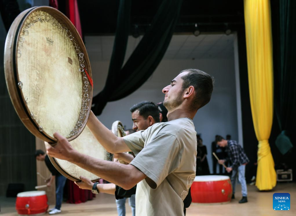 Artists of a local art troupe play the hand drum during a rehearsal in Taxkorgan Tajik Autonomous County, northwest China's Xinjiang Uygur Autonomous Region, Sept. 4, 2023. Taxkorgan Tajik Autonomous County has made great efforts in the integration of local culture and tourism in recent years, enriching the cultural life of people and promoting foreign exchanges. The county also carries forward traditional Chinese culture to build cultural tourism festivals, which shows the scenery of the Pamir Plateau and the happy and stable life of the people. (Xinhua/Lan Hongguang)