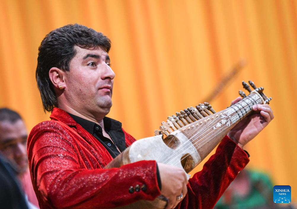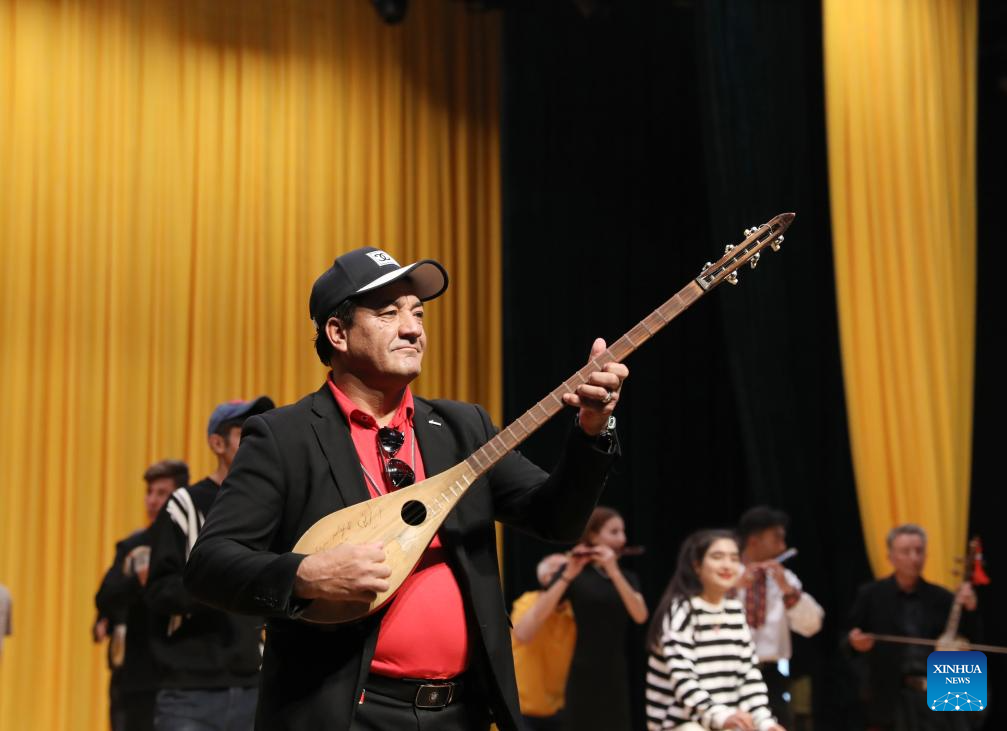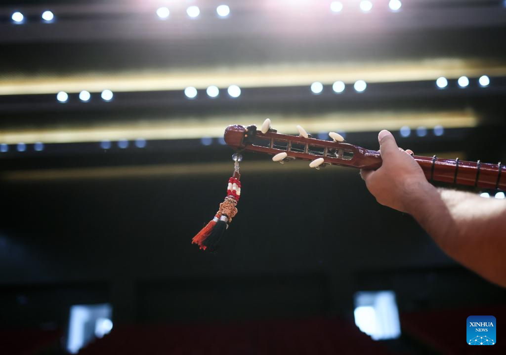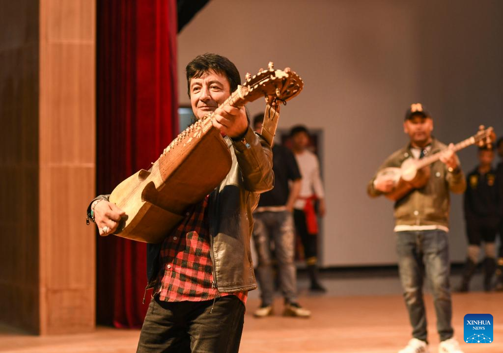 An artist of a local art troupe plays the traditional instrument during a rehearsal in Taxkorgan Tajik Autonomous County, northwest China's Xinjiang Uygur Autonomous Region, Sept. 4, 2023. Taxkorgan Tajik Autonomous County has made great efforts in the integration of local culture and tourism in recent years, enriching the cultural life of people and promoting foreign exchanges. The county also carries forward traditional Chinese culture to build cultural tourism festivals, which shows the scenery of the Pamir Plateau and the happy and stable life of the people. (Xinhua/Lan Hongguang)