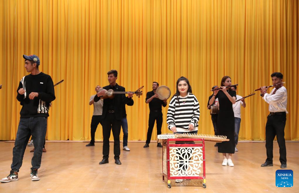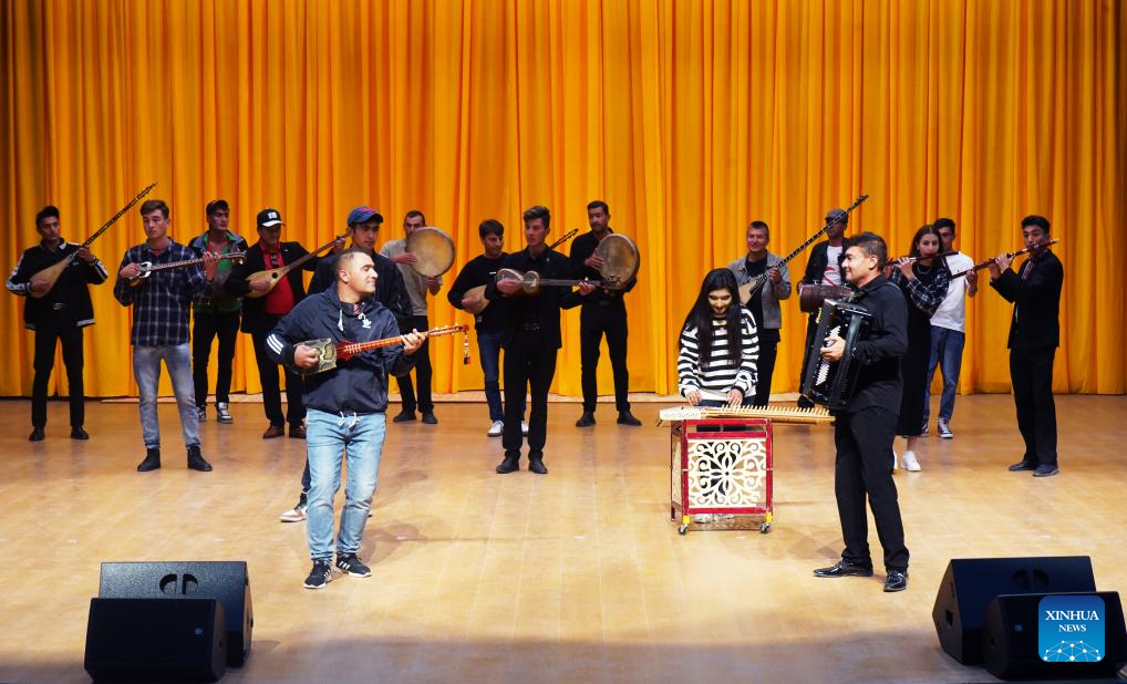 Artists of a local art troupe play the traditional instrument during a rehearsal in Taxkorgan Tajik Autonomous County, northwest China's Xinjiang Uygur Autonomous Region, Sept. 7, 2023. Taxkorgan Tajik Autonomous County has made great efforts in the integration of local culture and tourism in recent years, enriching the cultural life of people and promoting foreign exchanges. The county also carries forward traditional Chinese culture to build cultural tourism festivals, which shows the scenery of the Pamir Plateau and the happy and stable life of the people. (Xinhua/Hu Huhu)