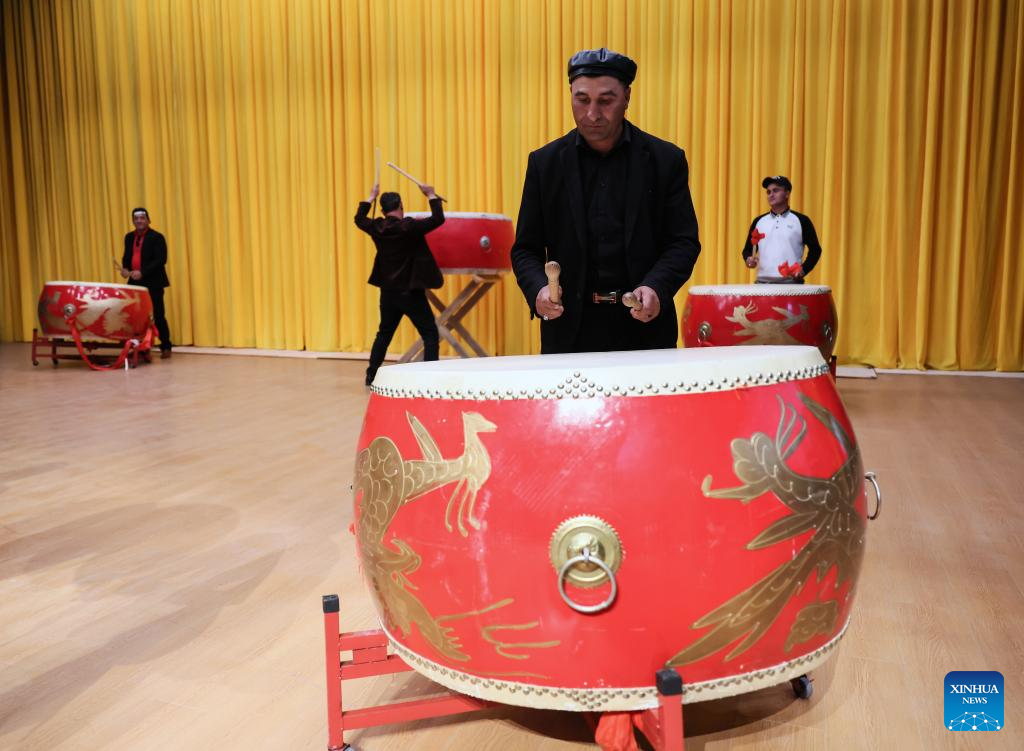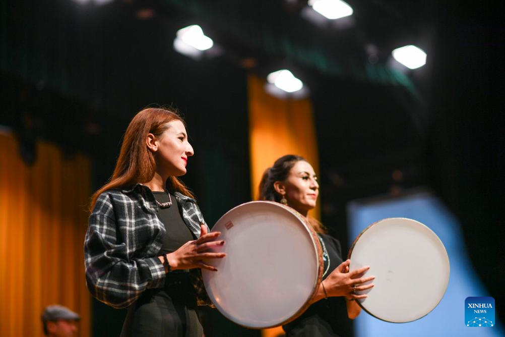 Artists of a local art troupe play the hand drum during a rehearsal in Taxkorgan Tajik Autonomous County, northwest China's Xinjiang Uygur Autonomous Region, Sept. 4, 2023. Taxkorgan Tajik Autonomous County has made great efforts in the integration of local culture and tourism in recent years, enriching the cultural life of people and promoting foreign exchanges. The county also carries forward traditional Chinese culture to build cultural tourism festivals, which shows the scenery of the Pamir Plateau and the happy and stable life of the people. (Xinhua/Hu Huhu)