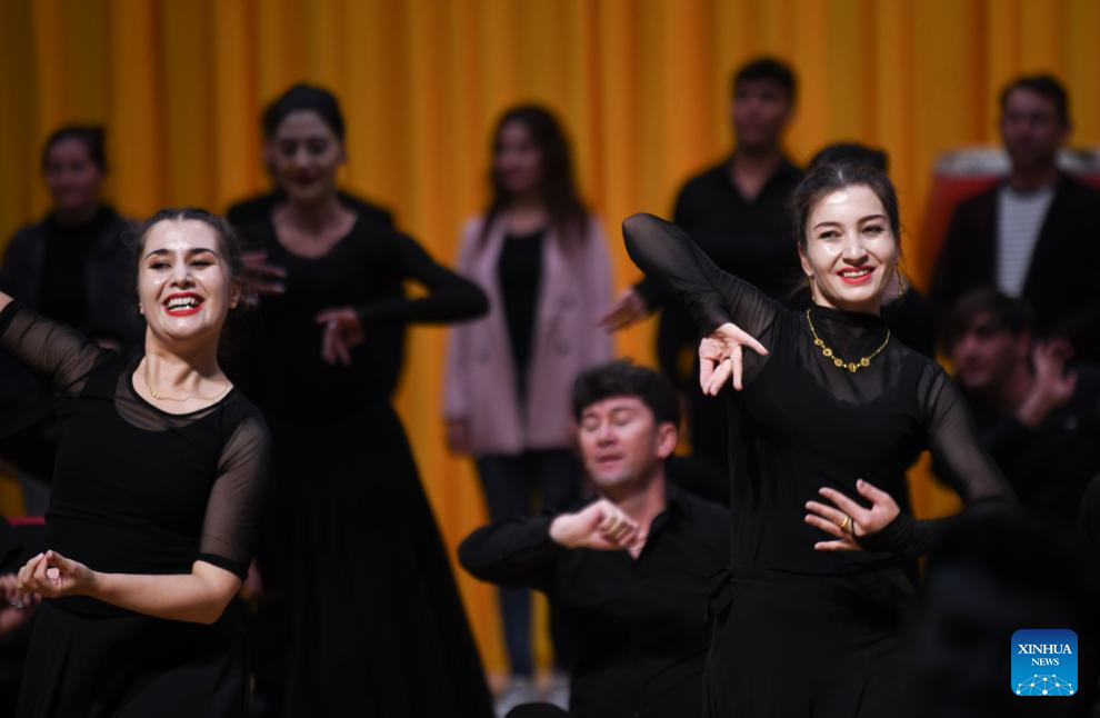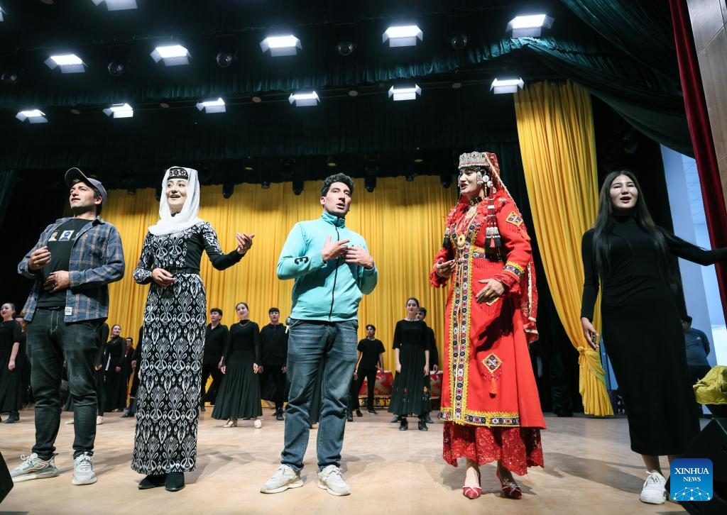Artists of a local art troupe rehearse a program in Taxkorgan Tajik Autonomous County, northwest China's Xinjiang Uygur Autonomous Region, Sept. 4, 2023. Taxkorgan Tajik Autonomous County has made great efforts in the integration of local culture and tourism in recent years, enriching the cultural life of people and promoting foreign exchanges. The county also carries forward traditional Chinese culture to build cultural tourism festivals, which shows the scenery of the Pamir Plateau and the happy and stable life of the people. (Xinhua/Cheng Tingting)