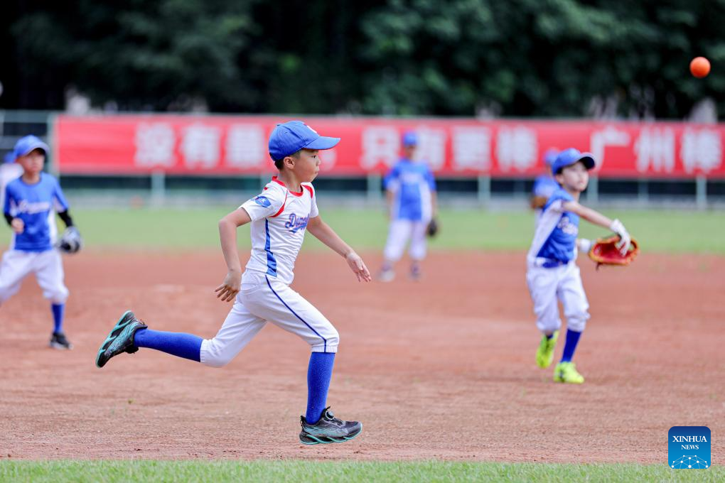 Children play baseball at Tianhe Baseball and Softball Stadium, which was the sports venue for softball at Guangzhou 2010 Asian Games in Guangzhou, south China's Guangdong Province, Aug. 22, 2023. Hangzhou will become the third city in China to host the Asian Games following Beijing in 1990 and Guangzhou in 2010. Some sports venues used or built for Beijing and Guangzhou Asian Games have already been open to the public after completion, which plays an important role in promoting mass fitness and attracting more people to get into sports. (Photo by Huang Jinwen/Xinhua)