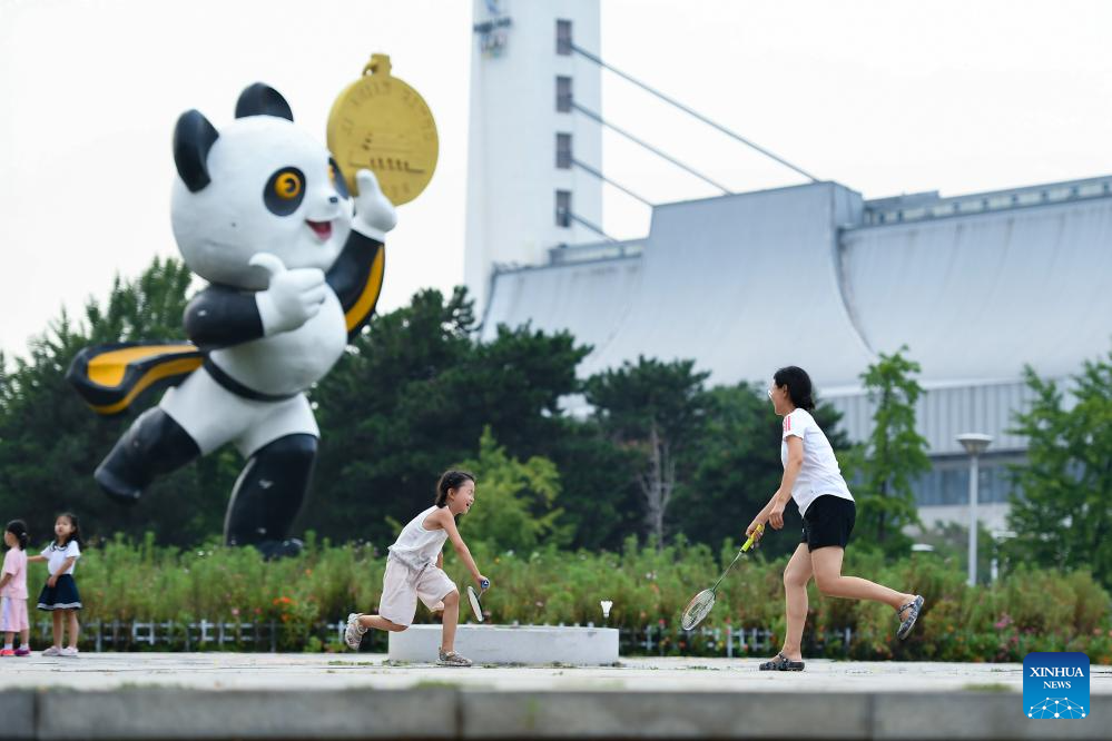 Citizens play badminton at National Olympic Sports Center, which was bulit for Beijing 1990 Asian Games in Beijing, capital of China, Aug. 20, 2023. Hangzhou will become the third city in China to host the Asian Games following Beijing in 1990 and Guangzhou in 2010. Some sports venues used or built for Beijing and Guangzhou Asian Games have already been open to the public after completion, which plays an important role in promoting mass fitness and attracting more people to get into sports. (Xinhua/Chen Zhonghao)