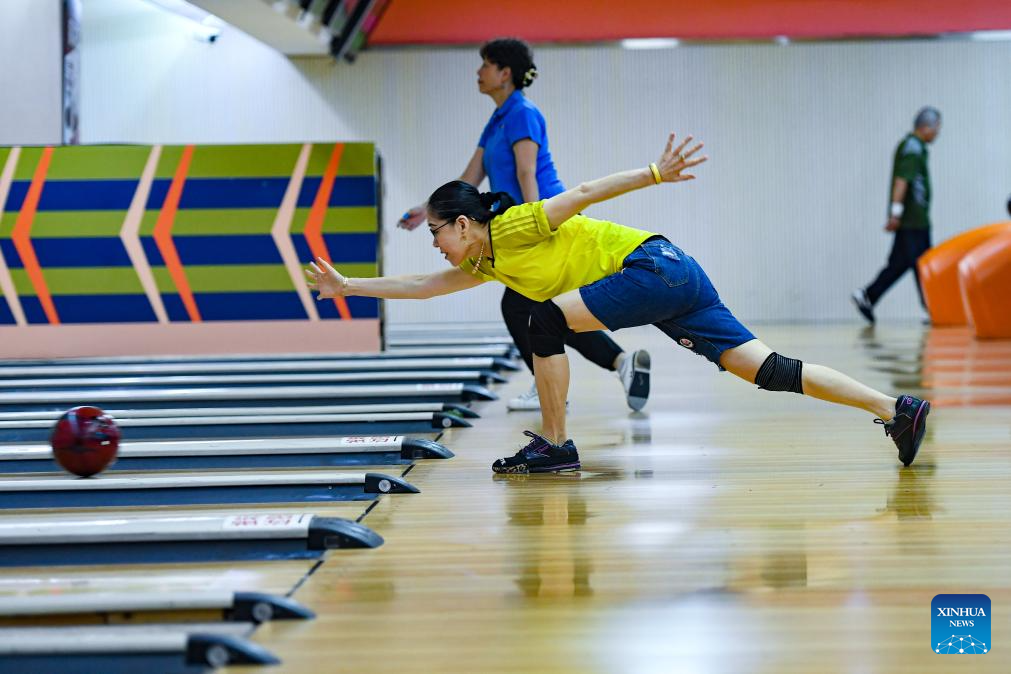 Citizens go bowling at Ditan Gymnasium, which was the sports venue for weightlifting at Beijing 1990 Asian Games in Beijing, capital of China, Aug. 18, 2023. Hangzhou will become the third city in China to host the Asian Games following Beijing in 1990 and Guangzhou in 2010. Some sports venues used or built for Beijing and Guangzhou Asian Games have already been open to the public after completion, which plays an important role in promoting mass fitness and attracting more people to get into sports. (Xinhua/Chen Zhonghao)