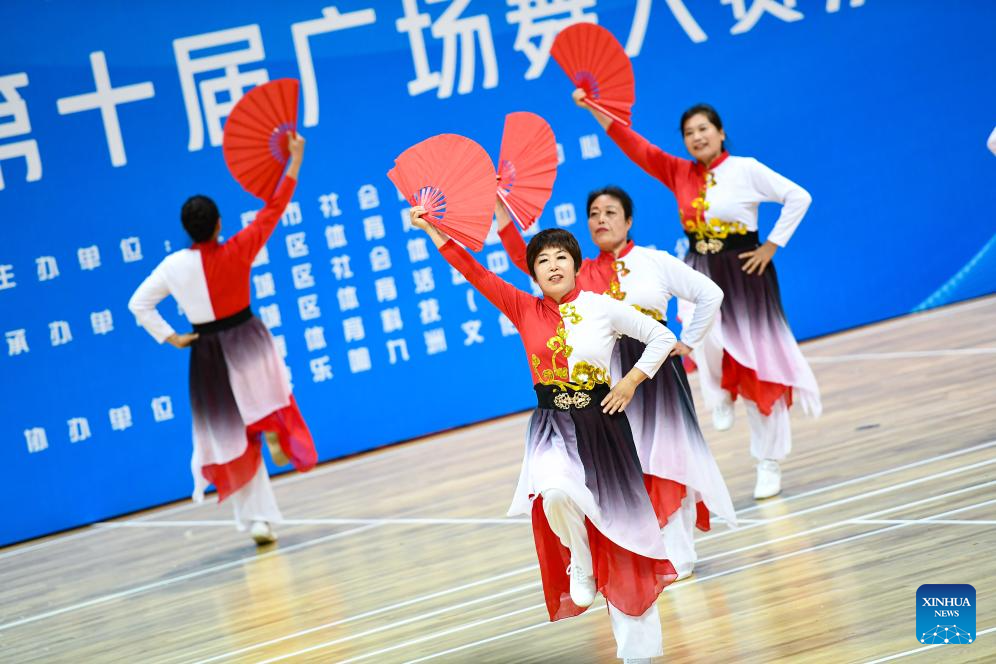 Citizens perform square dancing at Ditan Gymnasium, which was the sports venue for weightlifting at Beijing 1990 Asian Games in Beijing, capital of China, Aug. 18, 2023. Hangzhou will become the third city in China to host the Asian Games following Beijing in 1990 and Guangzhou in 2010. Some sports venues used or built for Beijing and Guangzhou Asian Games have already been open to the public after completion, which plays an important role in promoting mass fitness and attracting more people to get into sports. (Xinhua/Chen Zhonghao)