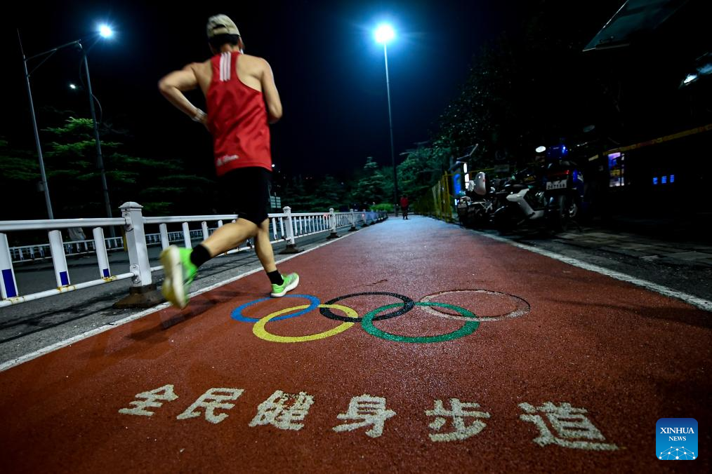 A citizen runs at National Olympic Sports Center, which was bulit for Beijing 1990 Asian Games in Beijing, capital of China, Aug. 20, 2023. Hangzhou will become the third city in China to host the Asian Games following Beijing in 1990 and Guangzhou in 2010. Some sports venues used or built for Beijing and Guangzhou Asian Games have already been open to the public after completion, which plays an important role in promoting mass fitness and attracting more people to get into sports. (Xinhua/Chen Zhonghao)