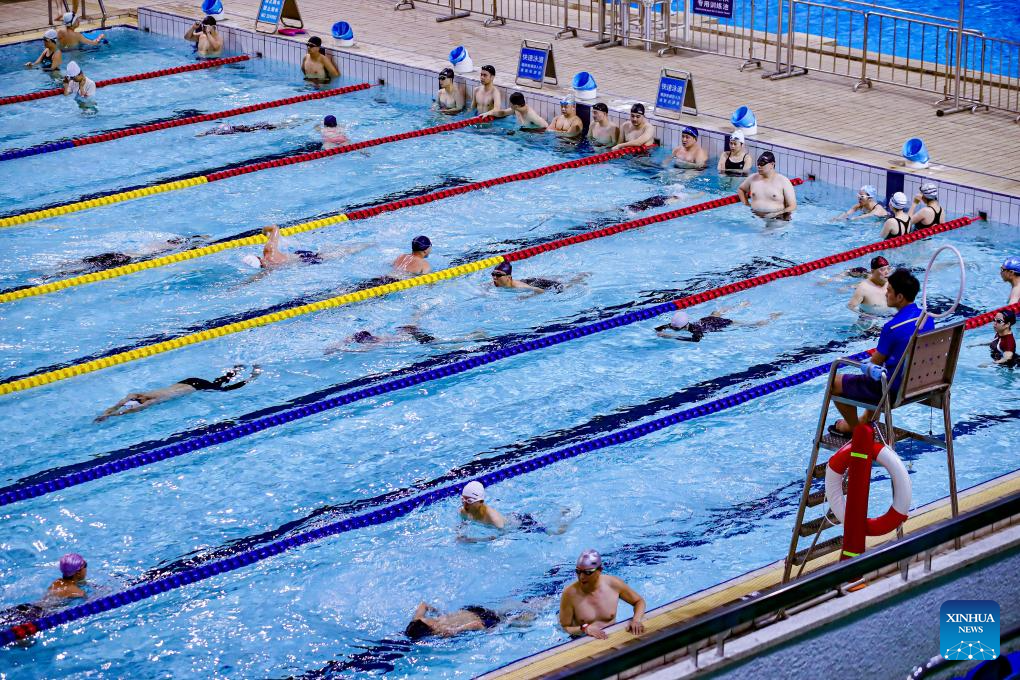 Citizens swim at Tianhe Natatorium, which was the sports venue for water polo at Guangzhou 2010 Asian Games in Guangzhou, south China's Guangdong Province, Aug. 21, 2023. Hangzhou will become the third city in China to host the Asian Games following Beijing in 1990 and Guangzhou in 2010. Some sports venues used or built for Beijing and Guangzhou Asian Games have already been open to the public after completion, which plays an important role in promoting mass fitness and attracting more people to get into sports. (Photo by Huang Jinwen/Xinhua)