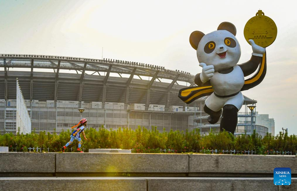 A child roller-skates past Panpan, the mascot for the Beijing 1990 Asian Games, at National Olympic Sports Center in Beijing, capital of China, Aug. 20, 2023. Hangzhou will become the third city in China to host the Asian Games following Beijing in 1990 and Guangzhou in 2010. Some sports venues used or built for Beijing and Guangzhou Asian Games have already been open to the public after completion, which plays an important role in promoting mass fitness and attracting more people to get into sports. (Xinhua/Chen Zhonghao)