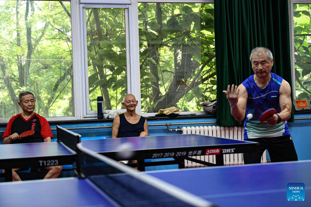 Citizens play table tennis at Ditan Gymnasium, which was the sports venue for weightlifting at Beijing 1990 Asian Games in Beijing, capital of China, Aug. 18, 2023. Hangzhou will become the third city in China to host the Asian Games following Beijing in 1990 and Guangzhou in 2010. Some sports venues used or built for Beijing and Guangzhou Asian Games have already been open to the public after completion, which plays an important role in promoting mass fitness and attracting more people to get into sports. (Xinhua/Chen Zhonghao)