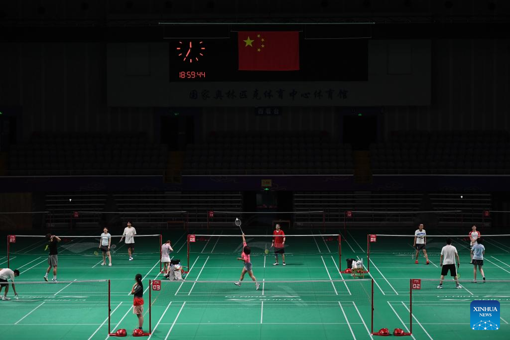 Citizens play badminton at National Olympic Sports Center Stadium, which was the sports venue for handball at Beijing 1990 Asian Games in Beijing, capital of China, Aug. 20, 2023. Hangzhou will become the third city in China to host the Asian Games following Beijing in 1990 and Guangzhou in 2010. Some sports venues used or built for Beijing and Guangzhou Asian Games have already been open to the public after completion, which plays an important role in promoting mass fitness and attracting more people to get into sports. (Xinhua/Chen Zhonghao)