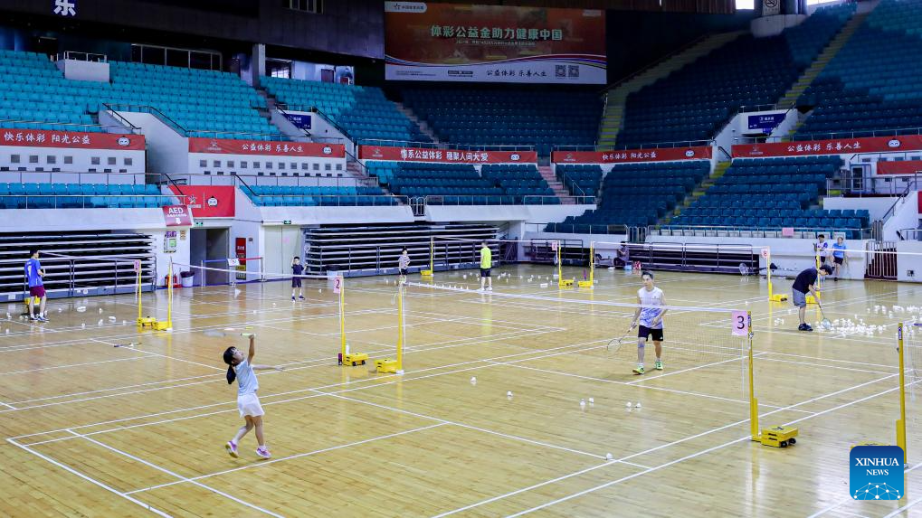 Citizens play badminton at Tianhe Gymnasium, which was the sports venue for badminton at Guangzhou 2010 Asian Games in Guangzhou, south China's Guangdong Province, Aug. 22, 2023. Hangzhou will become the third city in China to host the Asian Games following Beijing in 1990 and Guangzhou in 2010. Some sports venues used or built for Beijing and Guangzhou Asian Games have already been open to the public after completion, which plays an important role in promoting mass fitness and attracting more people to get into sports. (Photo by Huang Jinwen/Xinhua)