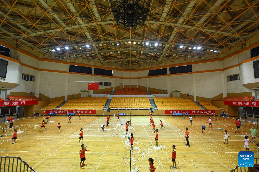 Children play badminton at Ditan Gymnasium, which was the sports venue for weightlifting at Beijing 1990 Asian Games in Beijing, capital of China, Aug. 21, 2023. Hangzhou will become the third city in China to host the Asian Games following Beijing in 1990 and Guangzhou in 2010. Some sports venues used or built for Beijing and Guangzhou Asian Games have already been open to the public after completion, which plays an important role in promoting mass fitness and attracting more people to get into sports. (Xinhua/Chen Zhonghao)