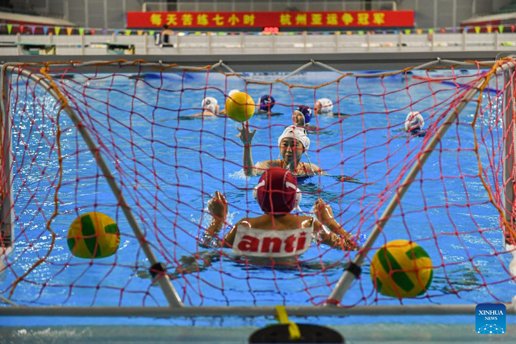 Children play water polo at Yingdong Natatorium, which was the sports venue for swimming at Beijing 1990 Asian Games, in National Olympic Sports Center in Beijing, capital of China, Aug. 20, 2023. Hangzhou will become the third city in China to host the Asian Games following Beijing in 1990 and Guangzhou in 2010. Some sports venues used or built for Beijing and Guangzhou Asian Games have already been open to the public after completion, which plays an important role in promoting mass fitness and attracting more people to get into sports. (Xinhua/Chen Zhonghao)