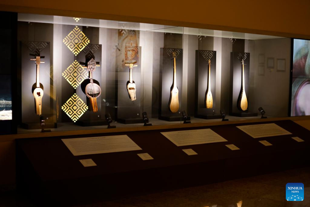 This photo taken on Sept. 8, 2023 shows traditional musical instruments displayed at the National Museum of the Republic of Kazakhstan in Astana, Kazakhstan. The National Museum of the Republic of Kazakhstan established in July 2014 is one of the largest museums in central Asia. It contains seven halls with a total exhibition area of 14,000 square meters. (Xinhua/Li Muzi)