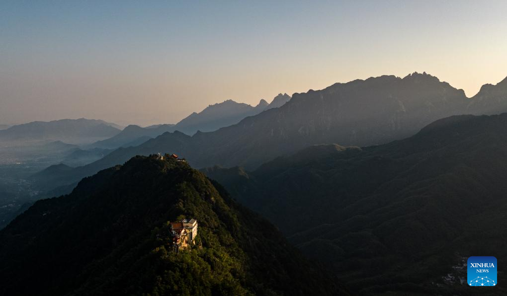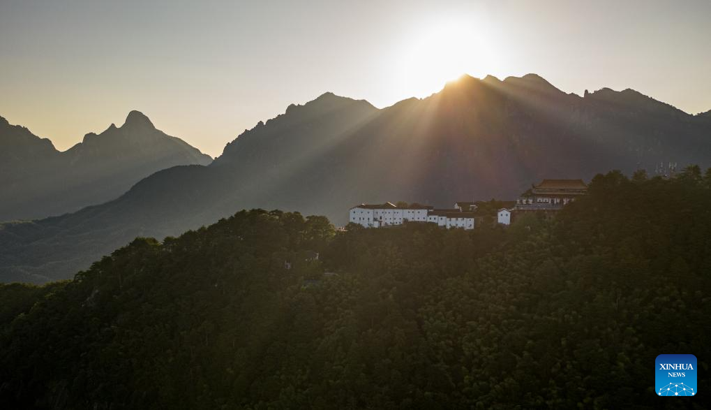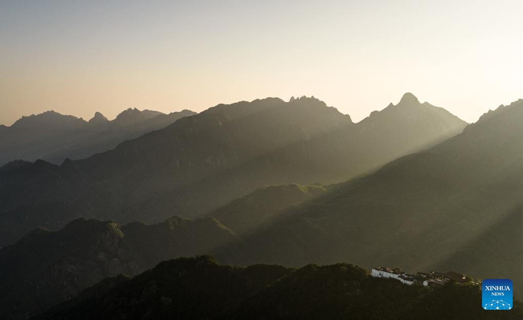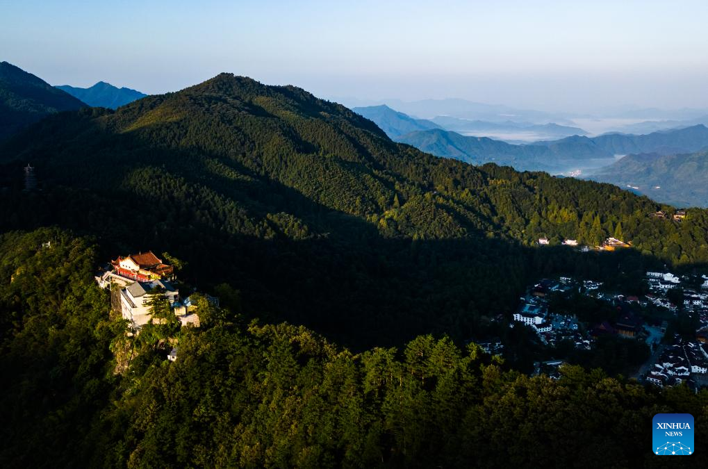 This aerial photo taken on Sept. 9, 2023 shows the scenery of Jiuhua Mountain at sunrise in Qingyang County of Chizhou, east China's Anhui Province. Jiuhua Mountain is one of the four sacred mountains of Chinese Buddhism and is also a national geological park. (Xinhua/Guo Chen)