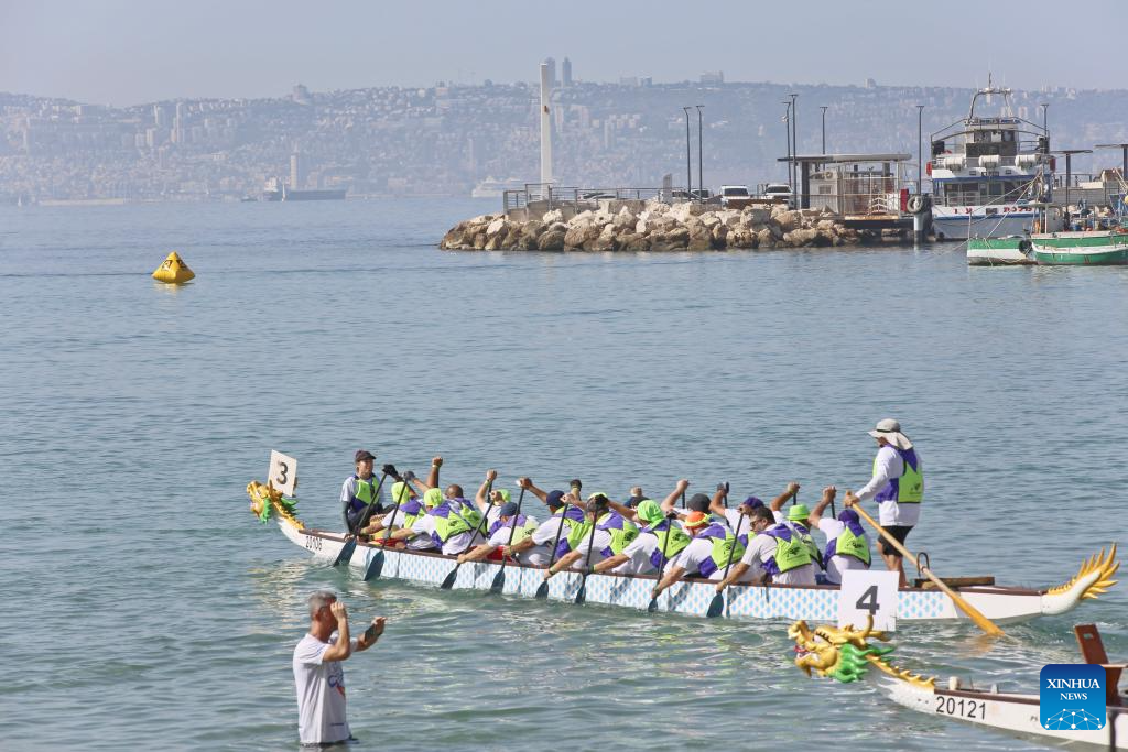 Participants compete during a dragon boat race in Akko, Israel, on Sept. 8, 2023. A dragon boat race was held in northern Israel on Friday, with hundreds of paddlers from 17 teams nationwide competing in the Mediterranean Sea. (Xinhua/Wang Zhuolun)
