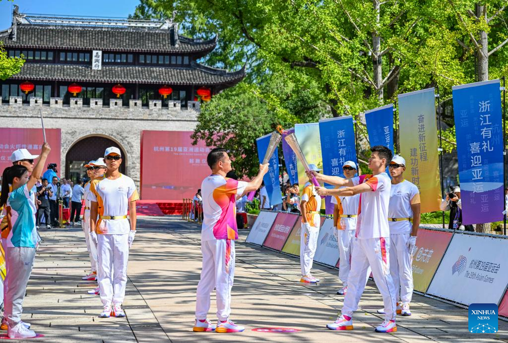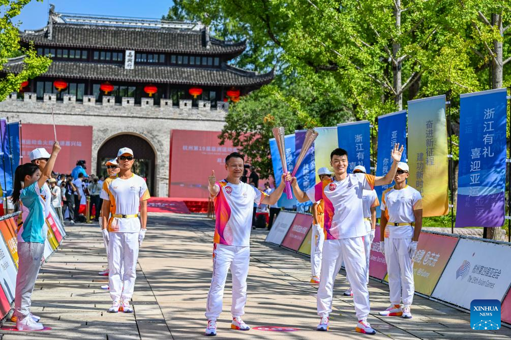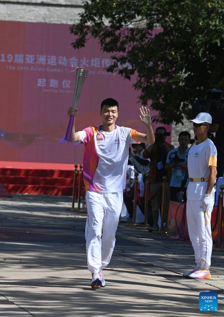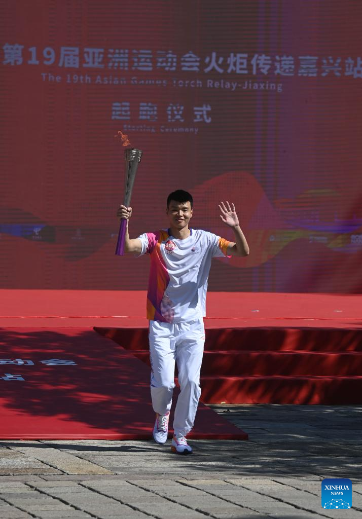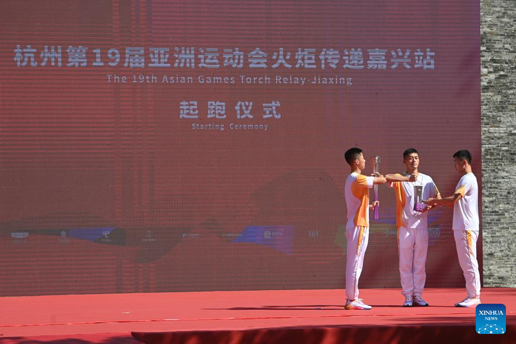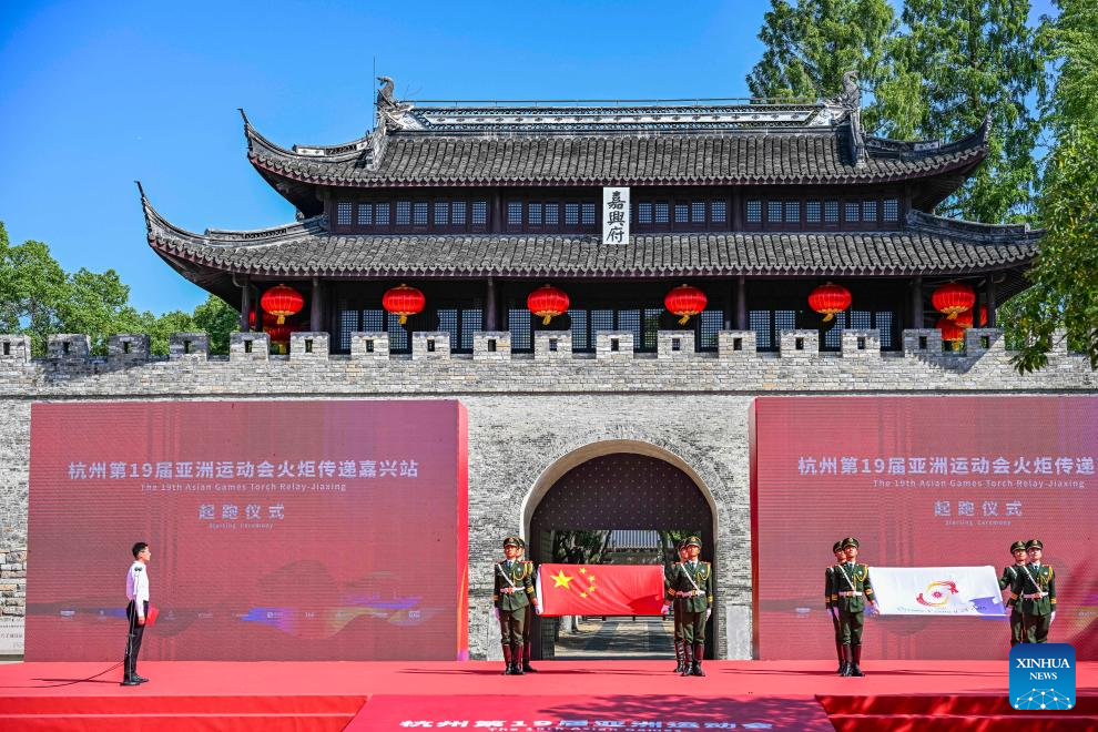 The photo taken on Sept. 10, 2023 show the starting ceremony of the torch relay of the 19th Asian Games in Jiaxing, east China's Zhejiang Province, Sept. 10, 2023. (Xinhua/Sun Fei)