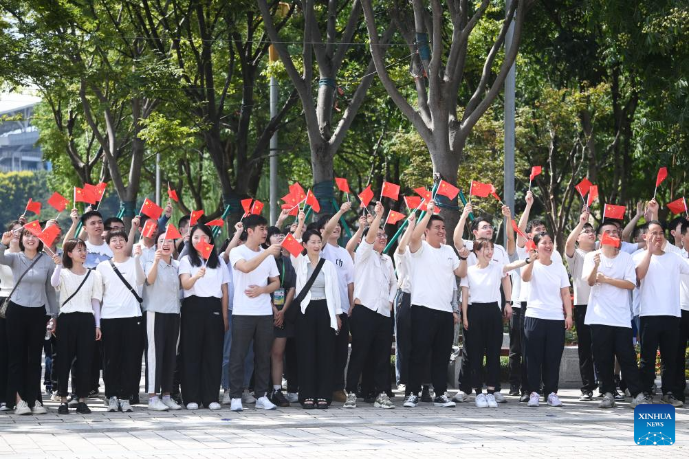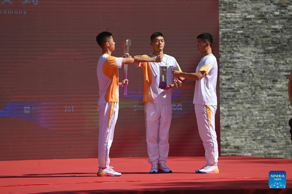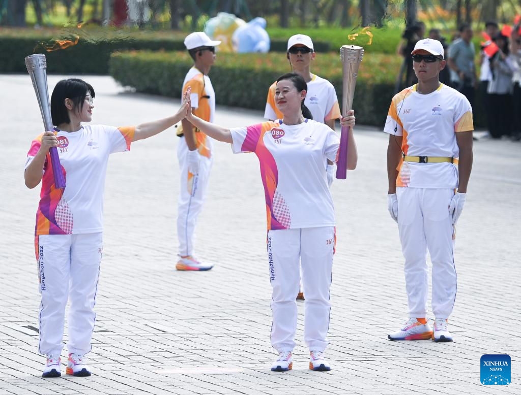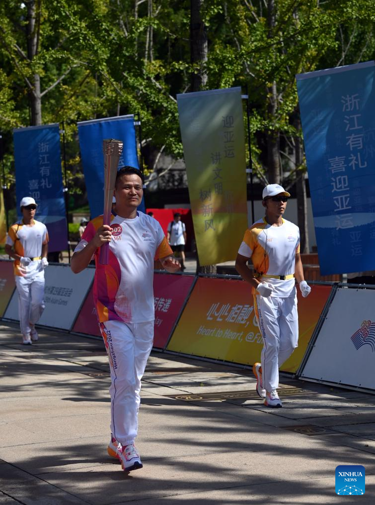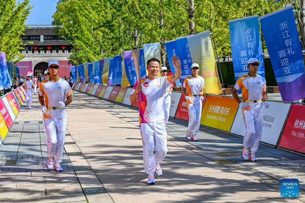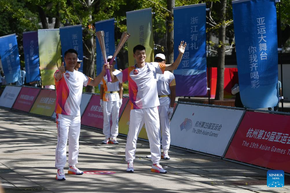 The photo taken on Sept. 10, 2023 show the starting ceremony of the torch relay of the 19th Asian Games in Jiaxing, east China's Zhejiang Province, Sept. 10, 2023. (Xinhua/Sun Fei)