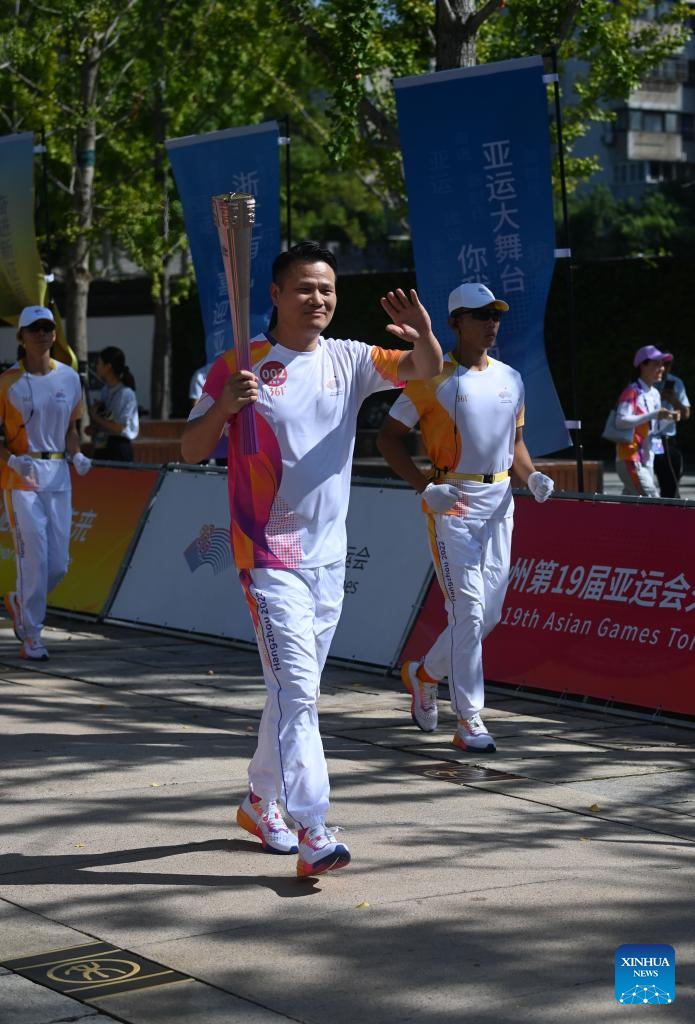 Torch bearer Fei Jianguo runs with the torch during the torch relay of the 19th Asian Games in Jiaxing, east China's Zhejiang Province, Sept. 10, 2023. (Xinhua/Xu Yu)