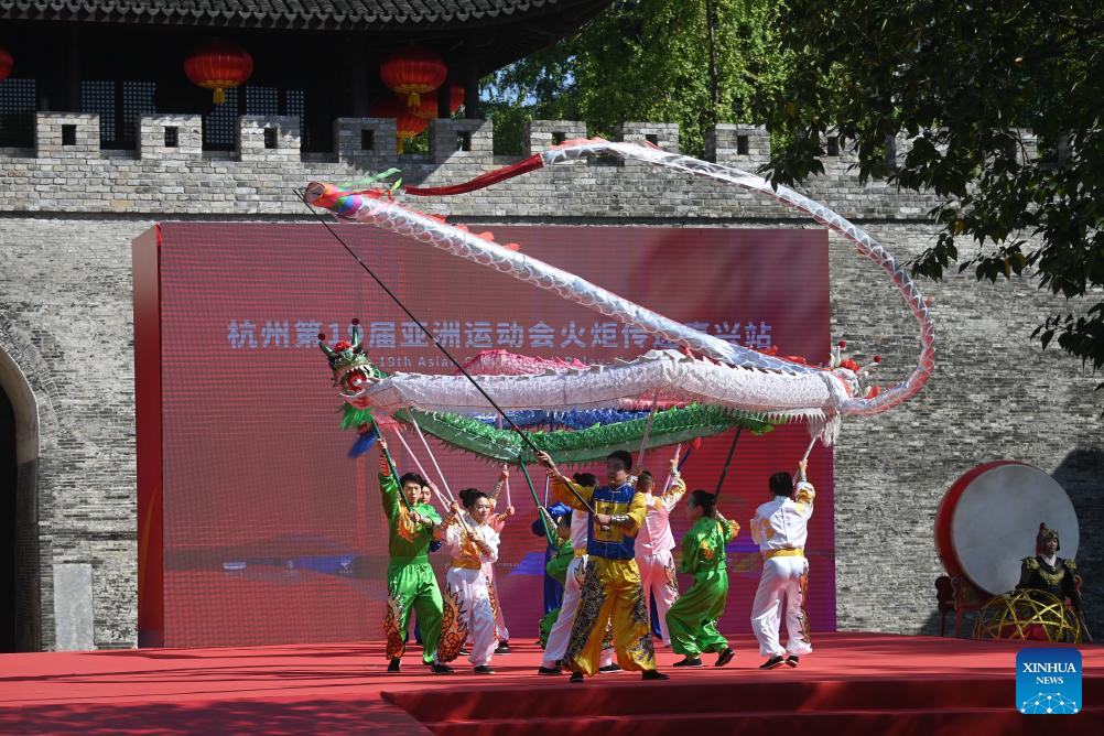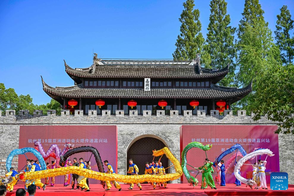 Dancers perform during the torch relay of the 19th Asian Games in Jiaxing, east China's Zhejiang Province, Sept. 10, 2023. (Xinhua/Xu Yu)