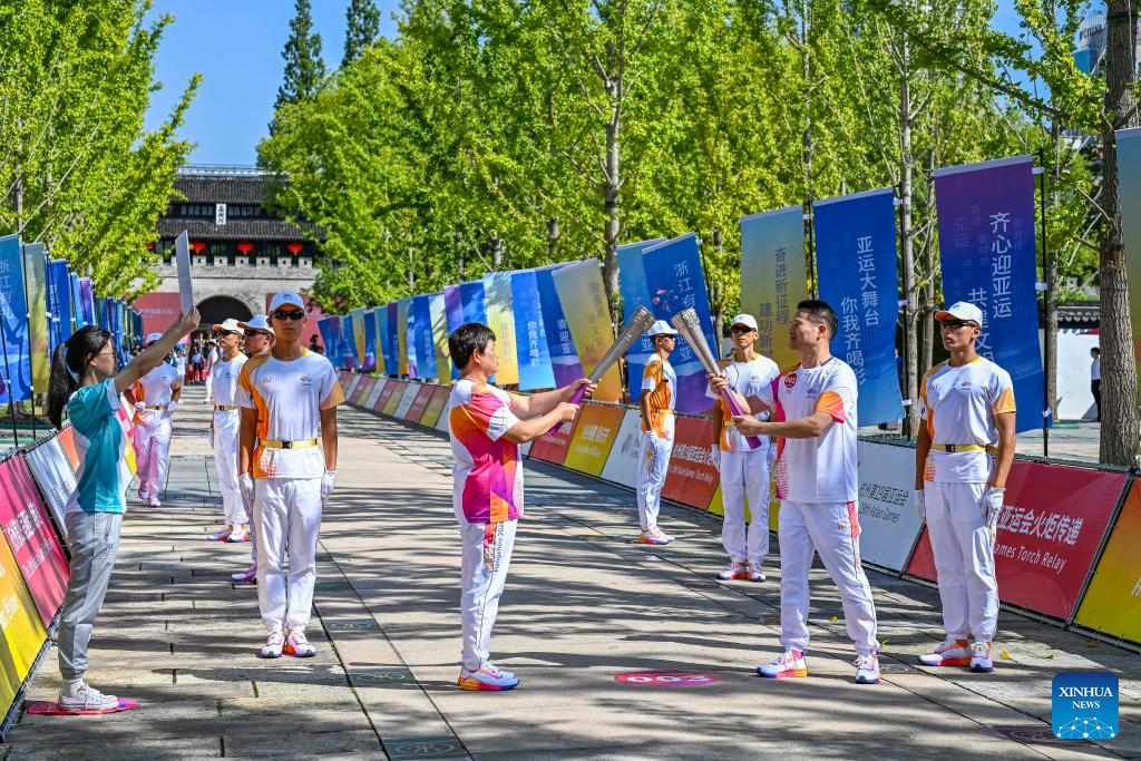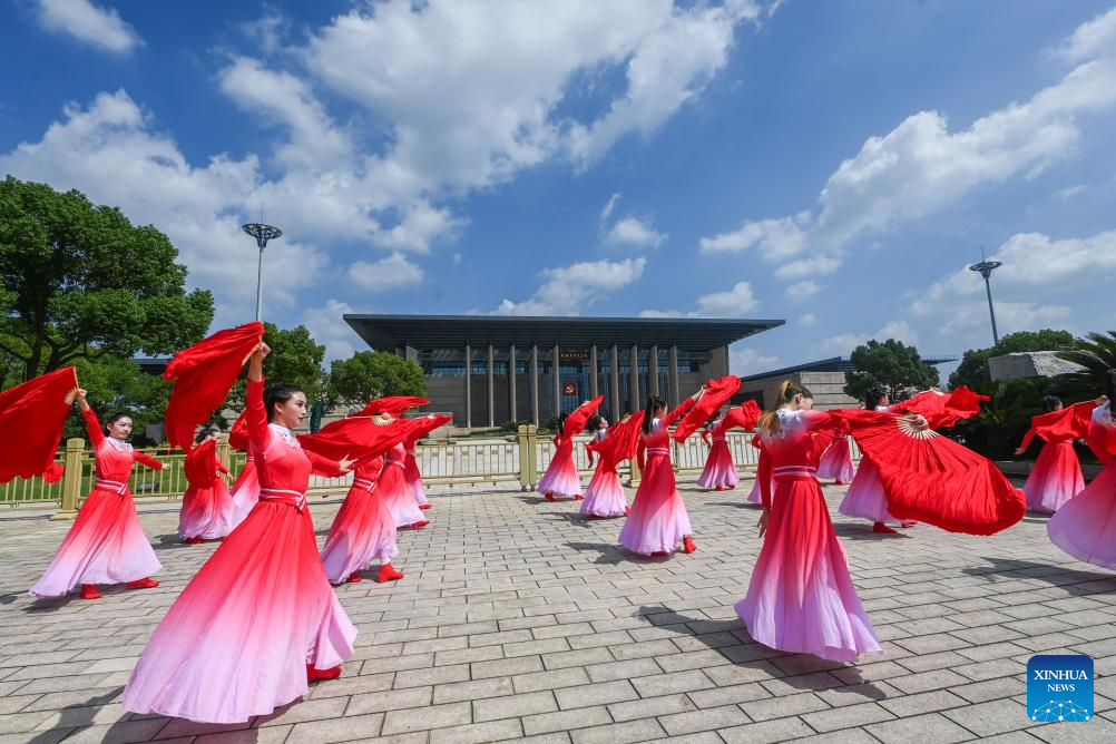 Actors and actresses perform before the torch relay of the 19th Asian Games in Jiaxing, east China's Zhejiang Province, Sept. 10, 2023. (Xinhua/Sun Fei)