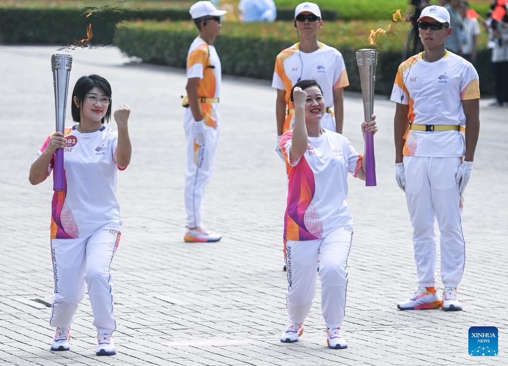 Staff members display the flame before the torch relay of the 19th Asian Games in Jiaxing, east China's Zhejiang Province, Sept. 10, 2023. (Xinhua/Xu Yu)