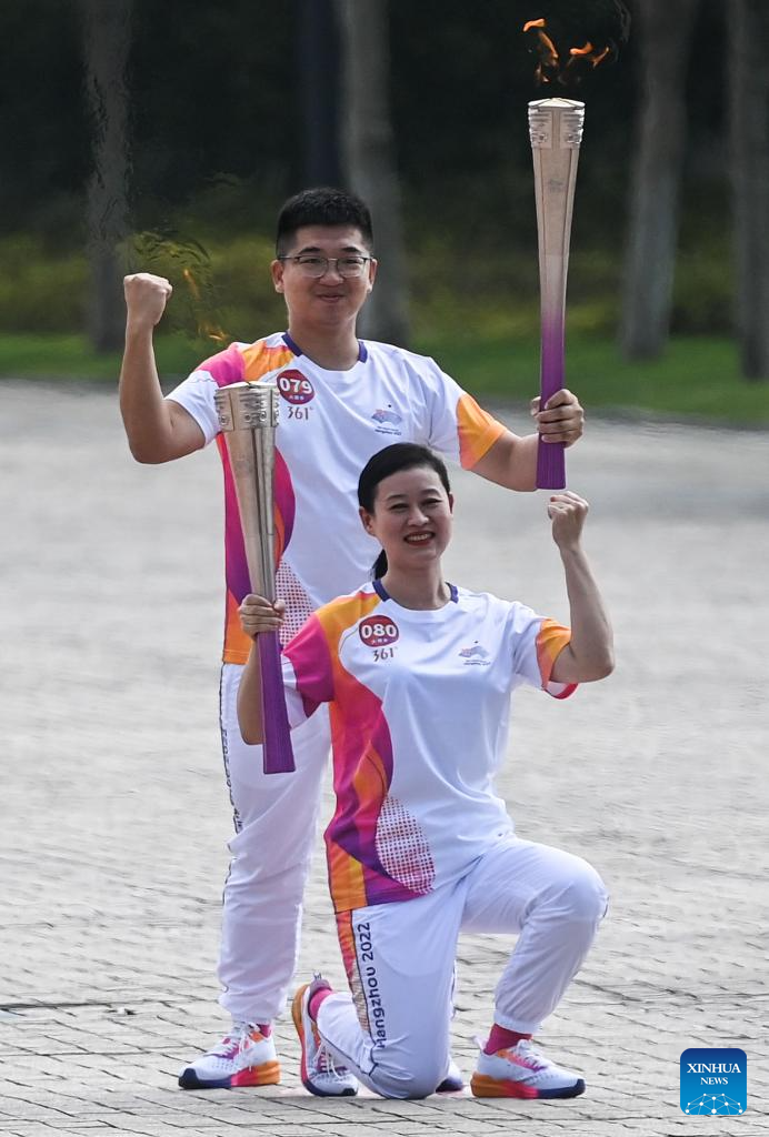 Torch bearers Gou Peng (rear) and Yuan Jing pose during the torch relay of the 19th Asian Games in Jiaxing, east China's Zhejiang Province, Sept. 10, 2023. (Xinhua/Xu Yu)