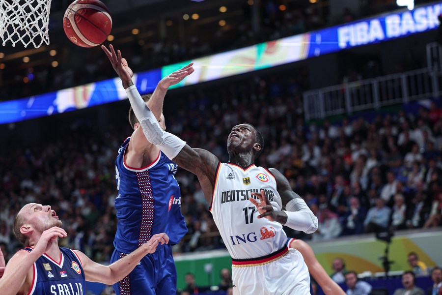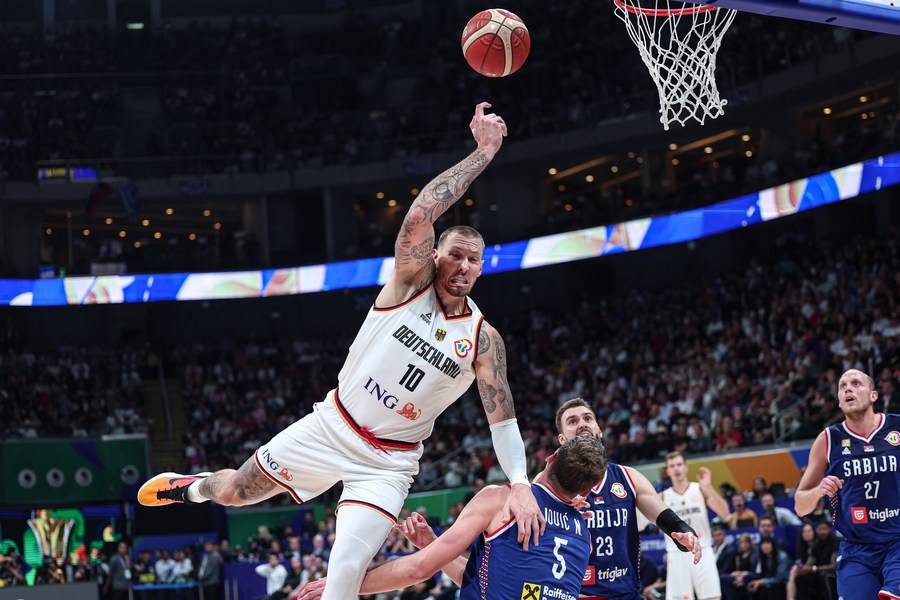 Daniel Theis (L) of Germany loses balance during the final against Serbia at the 2023 FIBA World Cup in Manila, the Philippines, Sept. 10, 2023. (Xinhua/Wu Zhuang)