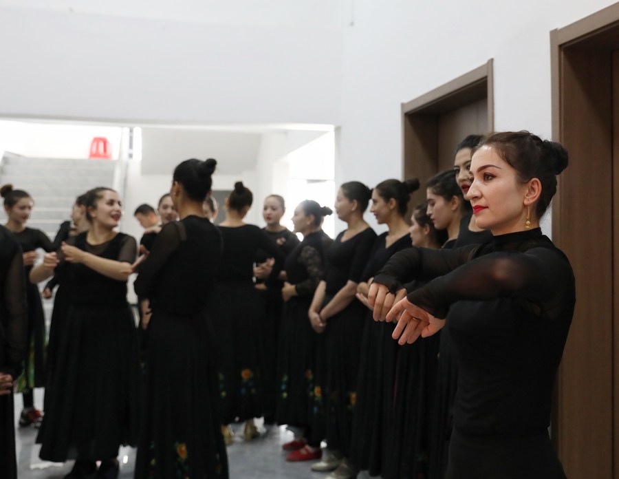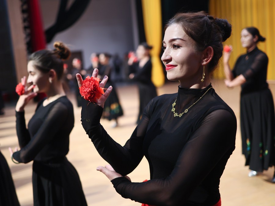 Artists of a local art troupe rehearse a dance in Taxkorgan Tajik Autonomous County, northwest China's Xinjiang Uygur Autonomous Region, Sept. 4, 2023. (Xinhua/Cheng Tingting)
