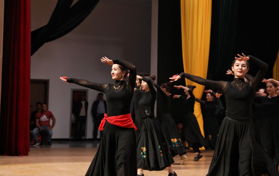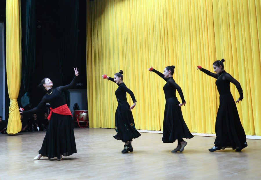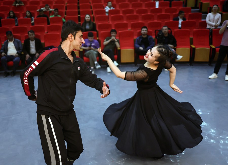 Artists of a local art troupe rehearse a dance in Taxkorgan Tajik Autonomous County, northwest China's Xinjiang Uygur Autonomous Region, Sept. 7, 2023. (Xinhua/Hu Huhu)