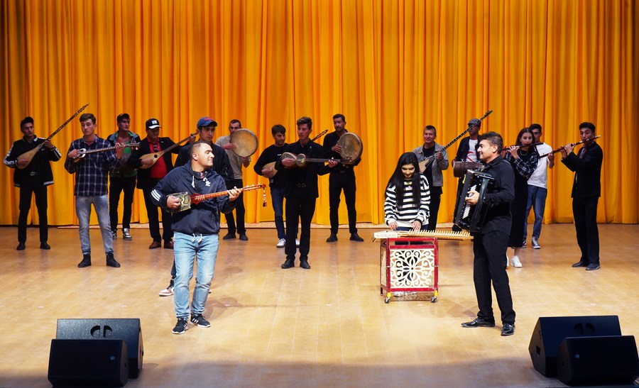 Artists of a local art troupe play the traditional instruments during a rehearsal in Taxkorgan Tajik Autonomous County, northwest China's Xinjiang Uygur Autonomous Region, Sept. 7, 2023. (Xinhua/Hu Huhu)